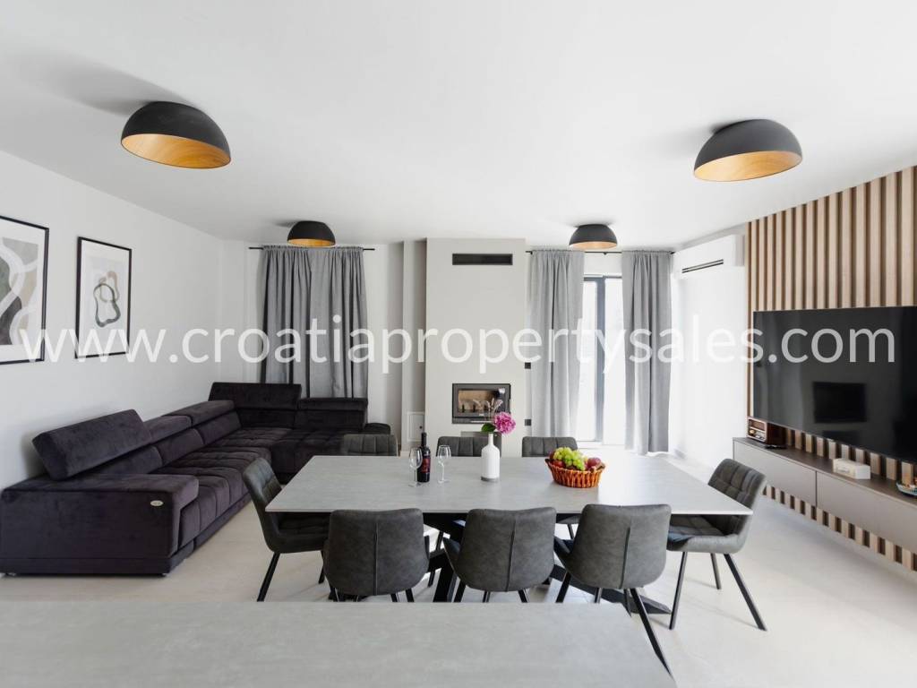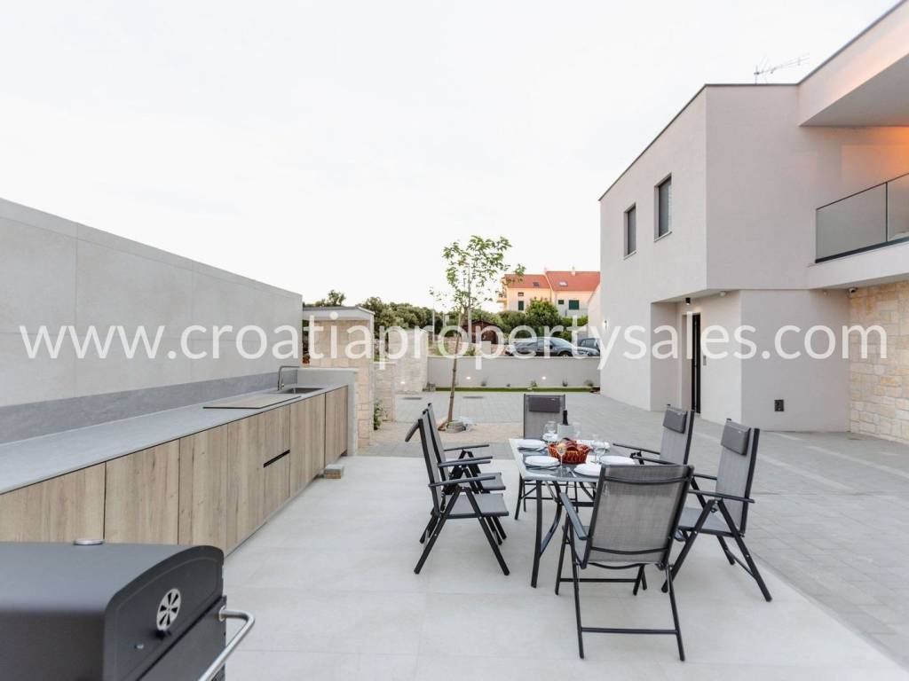 Modern semi-detached villa with swimming pool, just 300 m from the sea and beaches.It is south-facing and was built in 2023.On the island of Pag, this modern two-storey villa combines contemporary design with top-notch comfort, making it an ideal residence on the Adriatic coast.The design of the villa itself, as well as its facilities, such as a swimming pool, fitness, jacuzzi, lighting and a beautifully landscaped garden, make this property the perfect choice if you want to experience a real vacation on this beautiful island.The total living area is 230 m2. The villa consists of a ground floor and an upper floor.On the ground floor there is an open, spacious living room with a kitchen and dining room, and one, out of a total of four bedrooms, and a bathroom.The living room opens onto a terrace that continues onto a modern paved courtyard and landscaped garden, with a swimming pool and a sunbathing area.The outdoor area is ideally designed for outdoor parties or enjoying family moments.The pool has a heat pump with an automated maintenance system, covered with ceramic tiles.Next to the pool is a jacuzzi and a summer kitchen with a barbecue, covered with a pergola.The lighting in the courtyard highlights the beautiful architecture of the villa and provides an elegant look to the outdoor area.From the ground floor, an internal staircase leads to the first floor where there are three more bedrooms with bathrooms. Two rooms have their own balcony.There is also a fitness room on the first floor.The villa is built of brick and reinforced concrete construction with a flat roof and 15 cm of hydro and thermal insulation.Preparation for solar panels and a three-phase electricity connection have been installed. Natural stone was used as an aesthetic detail, along with spider glass railings on the terrace.The villa is equipped with high-quality materials, including Marazzi ceramic tiles and three-layer anthracite joinery with a bronze effect and mosquito nets.Daikin's heat pump system provides heating, cooling and hot water A***, also a floor heating and convectors ensure additional comfort. The smart house system enables control via a mobile phone, tablet or computer.There are two parking spaces at the entrance to the yard. Additional features include car chargers, video surveillance and code entry.