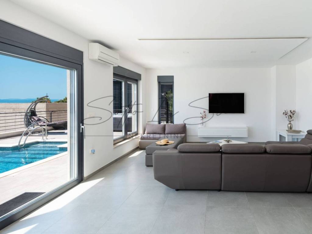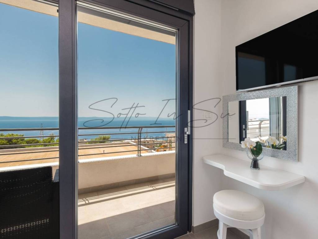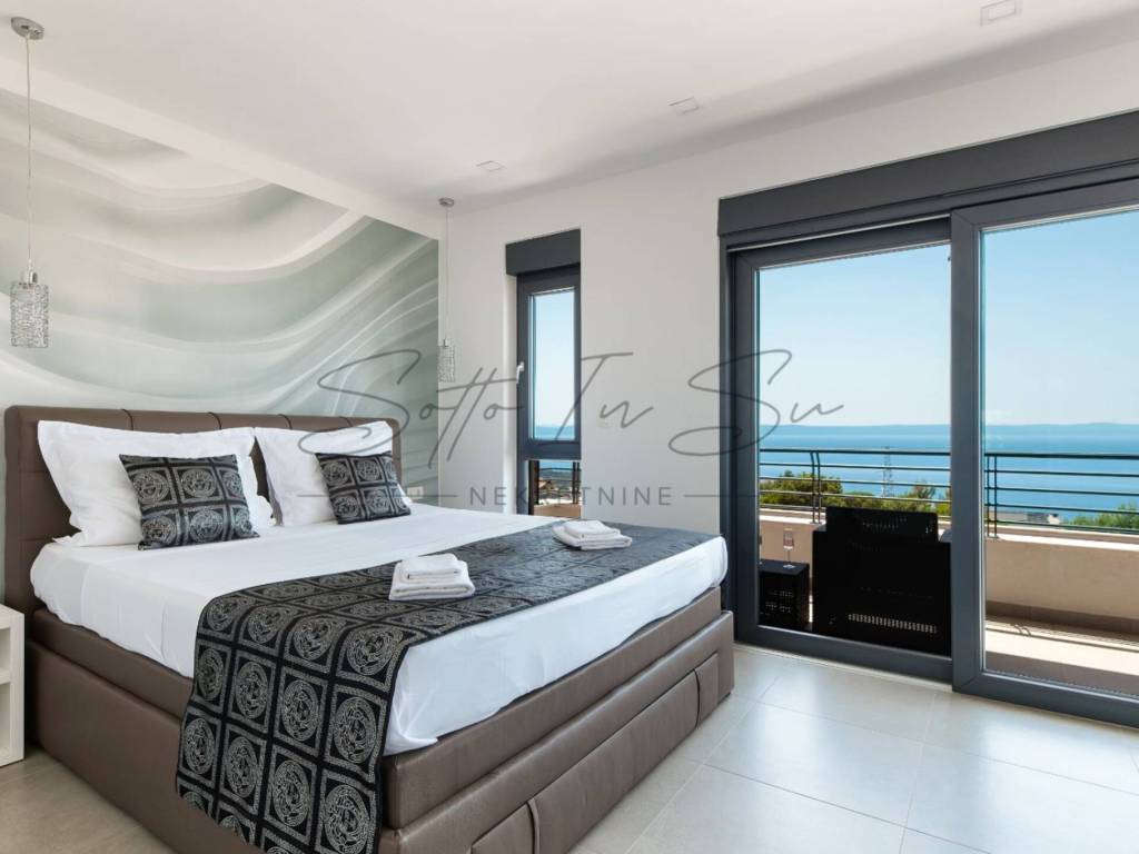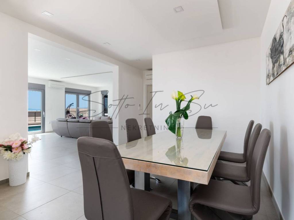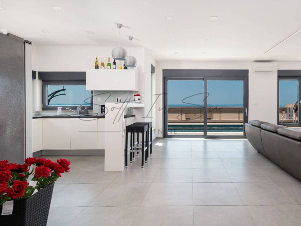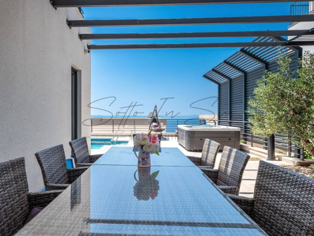 The property offers a stunning, unobstructed sea view from both the interior and the terrace, where you will find a swimming pool with sun loungers and a hydromassage hot tub.