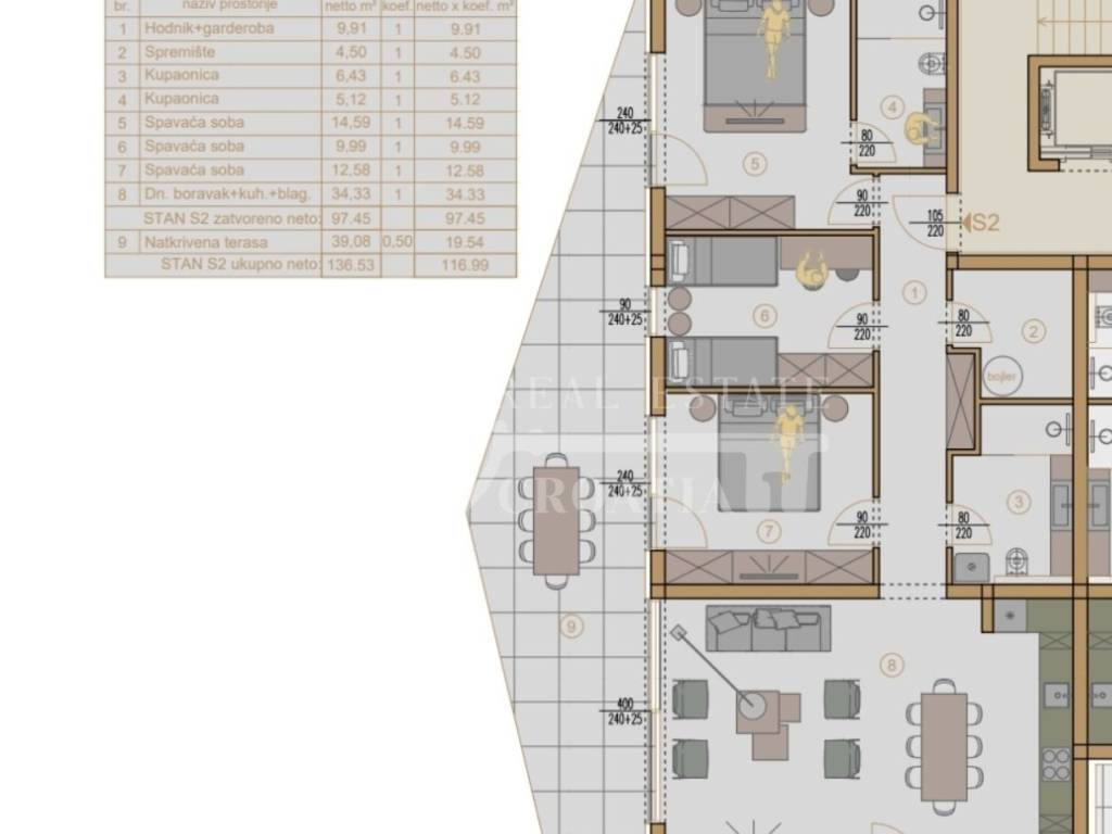 Ukupne površine 116,99 m (bruto 136,53 m), stan se ističe izvrsnim rasporedom i direktnim izlazom iz svih glavnih prostorija na prostranu natkrivenu terasu i vrt.