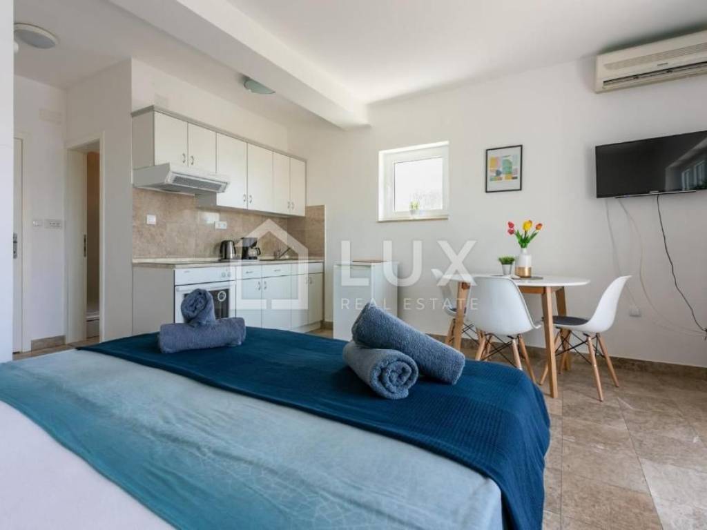 The house consists of a ground floor and 3 floors. On the ground floor there is a two-bedroom apartment, on the first floor there is a three-bedroom apartment, while on the second and third floors there are two studios and two one-bedroom apartments. All apartments on the upper floors have terraces with a sea view. The house is being sold fully furnished, and all apartments have a kitchen and renovated bathrooms with a washing machine.