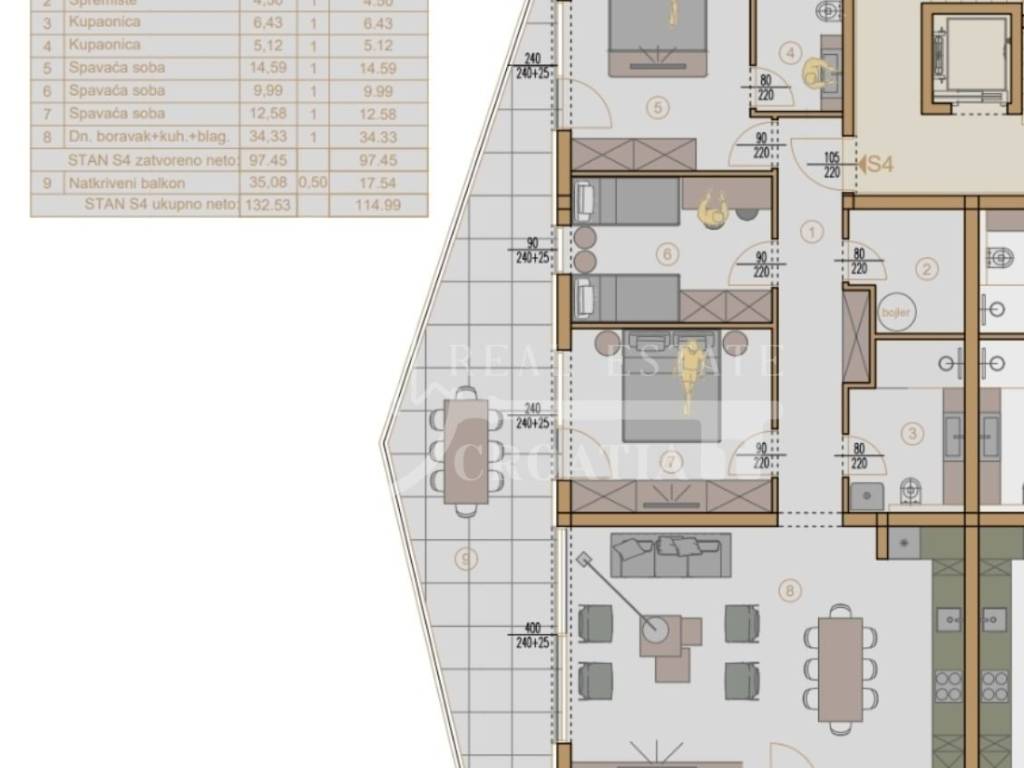 Ukupna neto površina iznosi 115 m, s izvanredno raspoređenim prostorijama koje pružaju udobnost za obiteljski život ili luksuzno korištenje za odmor.