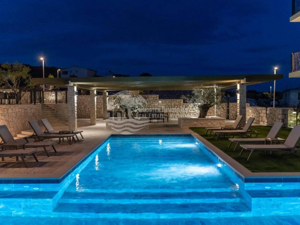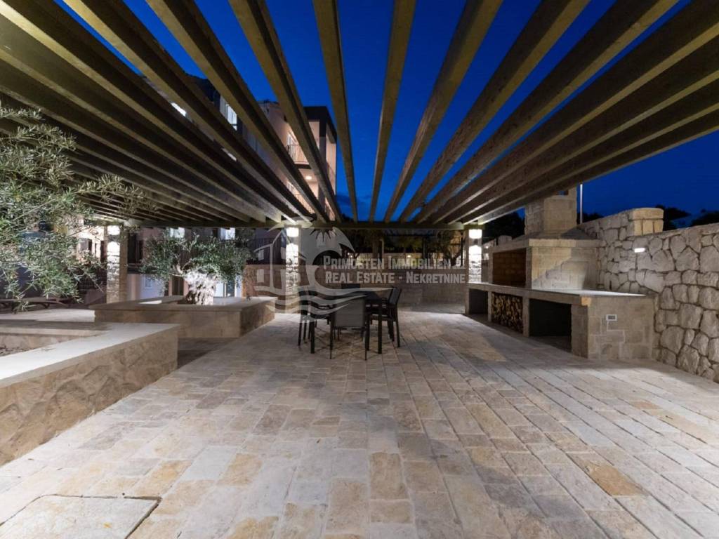 SENSATIONAL OFFER! We mediate in the sale of a fully furnished apartment located in a newly built residential building consisting of 6 residential units. Apartment S3 is located on the first floor and has a living area with a terrace and parking space ratio of 72.28 m2. The apartment consists of a living room, kitchen and dining room (23.73 m2), two bedrooms (9.80 m2 and 10.20 m2), bathroom (4.62 m2) and hallway (5.25 m2). From the living room and from the bedrooms there is access to two covered terraces (23.86 m2 and 8.50 m2) with a beautiful view of the sea. The apartment has one outdoor parking space. Sevid is a place that has developed especially for tourism in the last few years, it is surrounded by clean sea and is located outside the everyday crowd and noise of urban areas. This is a complex of three buildings that have common facilities: a paved courtyard with a heated pool of 100 m², a sauna and an area for exercise and recreation, 2 large wooden pergolas with shades for the outdoor area as protection from the sun; grill, fireplace, bread oven, and these facilities can be supplemented later with a pantry and a refrigerator. There is also a garden in the complex, which is decorated with greenery as a hedge. This apartment in a new building is a unique investment opportunity ideal for a year-round stay or tourist rental.