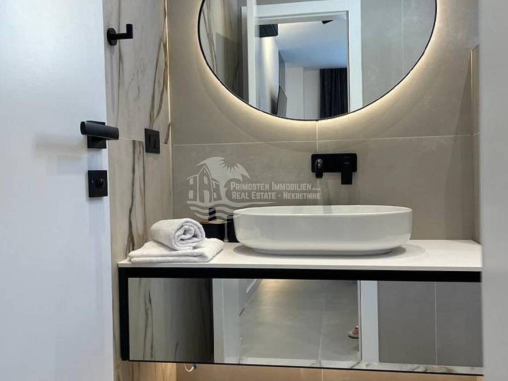 We are mediating the sale of this elegant property with luxurious decoration, which covers 344 square meters and provides maximum comfort and convenience thanks to first-class facilities and high-quality equipment. This modern villa was built on a plot of 544 m2 in Okrug Gornji, in the third row to the sea. The villa is organized on three floors. On the ground floor there is a spacious living room, dining room and kitchen, toilet, storage room and one bedroom with a bathroom. From the living room you can reach the covered terrace where there is a heated swimming pool and a sun deck where you can enjoy the wonderful view of the sea and spectacular sunsets. The villa's internal stairs lead to the first floor, where there are three bedrooms, each of which has its own bathroom and a balcony with an open view of the sea. In the basement there is a garage, pool engine room, fitness, sauna, laundry and bathroom. The villa is sold fully furnished. Technical equipment includes an alarm system, intercom, underfloor heating throughout the house, all rooms are air-conditioned and built according to the latest construction standards. The villa has a garage and parking for several cars.