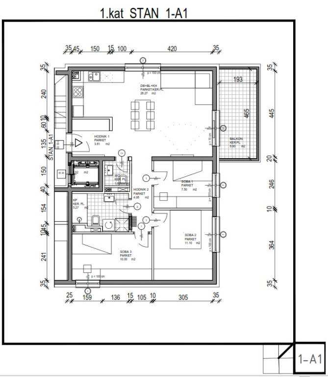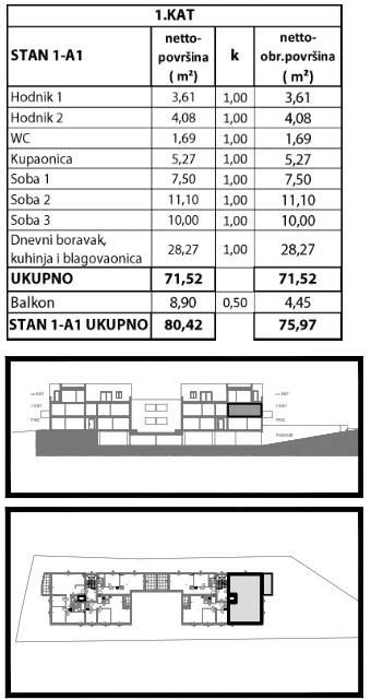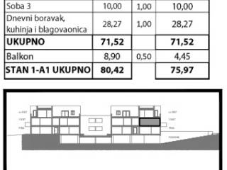Stan 1-A1 ima 71,52 m2 neto stambene površine, a pripada mu i balkon od 8,90 m2 (obračunski 4,45 m2). Ukupna obračunska površina iznosi 75,97 m2, dok ukupna korisna površina doseže 80,42 m2.