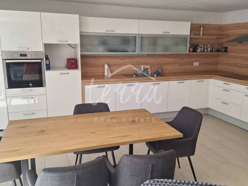 The ground floor of the house consists of a terrace, an entrance hall, a large fully equipped kitchen with a dining room and a living room, and a large bathroom with a separate toilet.