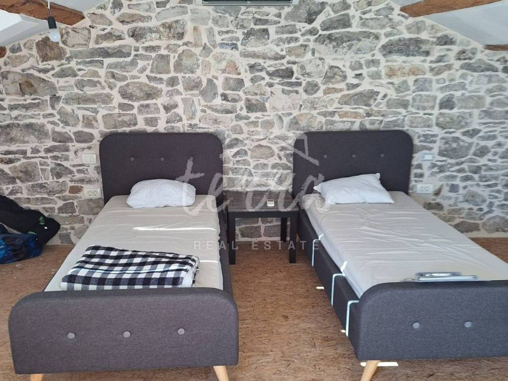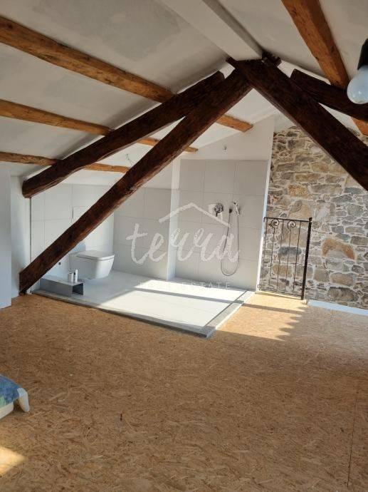 On the second floor, there is a huge bedroom, with visible antique beams, a beautiful loggia with a view of Kvarner, Cape Kamenjak and Raška Bay, and a bathroom with shower and toilet.