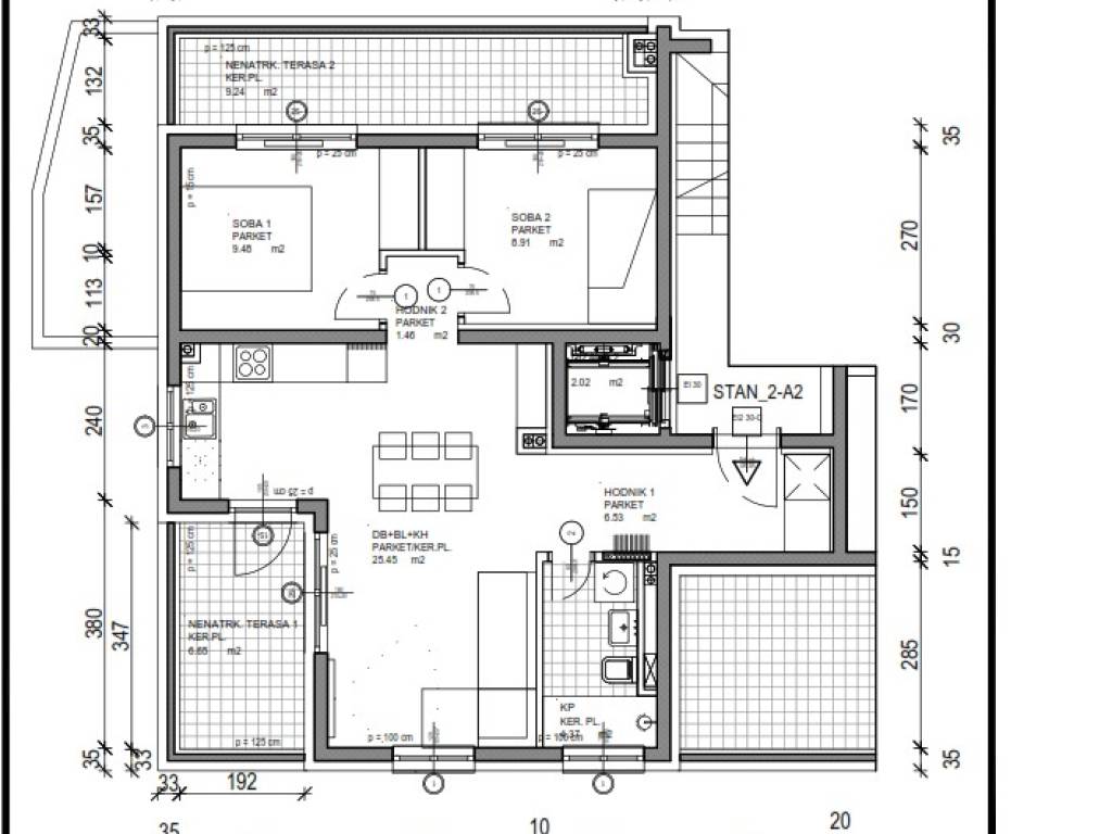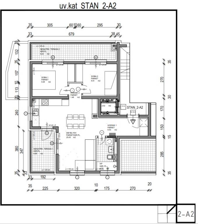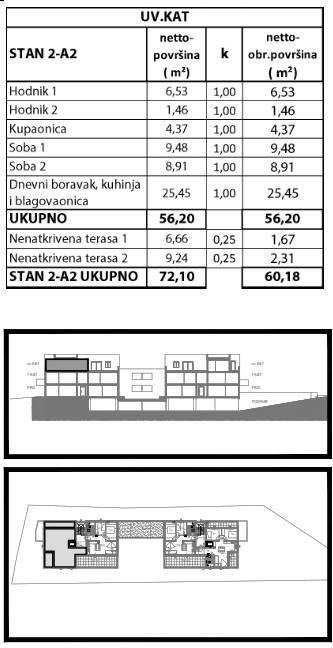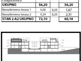 Stan 2-A2 ima 56,20 m2 neto stambene površine, a pripadaju mu dvije nenatkrivene terase – 6,66 m2 i 9,24 m2 (obračunski ukupno 3,98 m2). Ukupna obračunska površina stana iznosi 60,18 m2, dok ukupna korisna površina doseže 72,10 m2.
