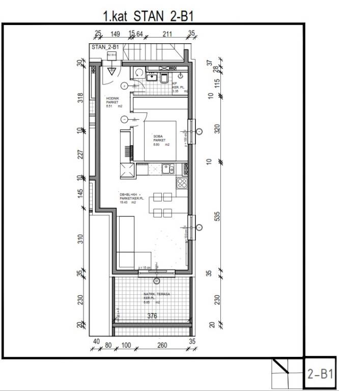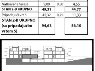 Stan 2-B1 ima 40,09 m2 neto stambene površine te natkrivenu terasu površine 8,65 m2 (obračunski 4,33 m2).