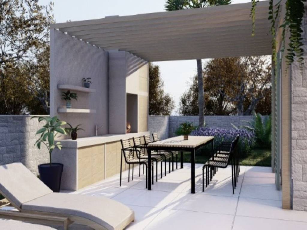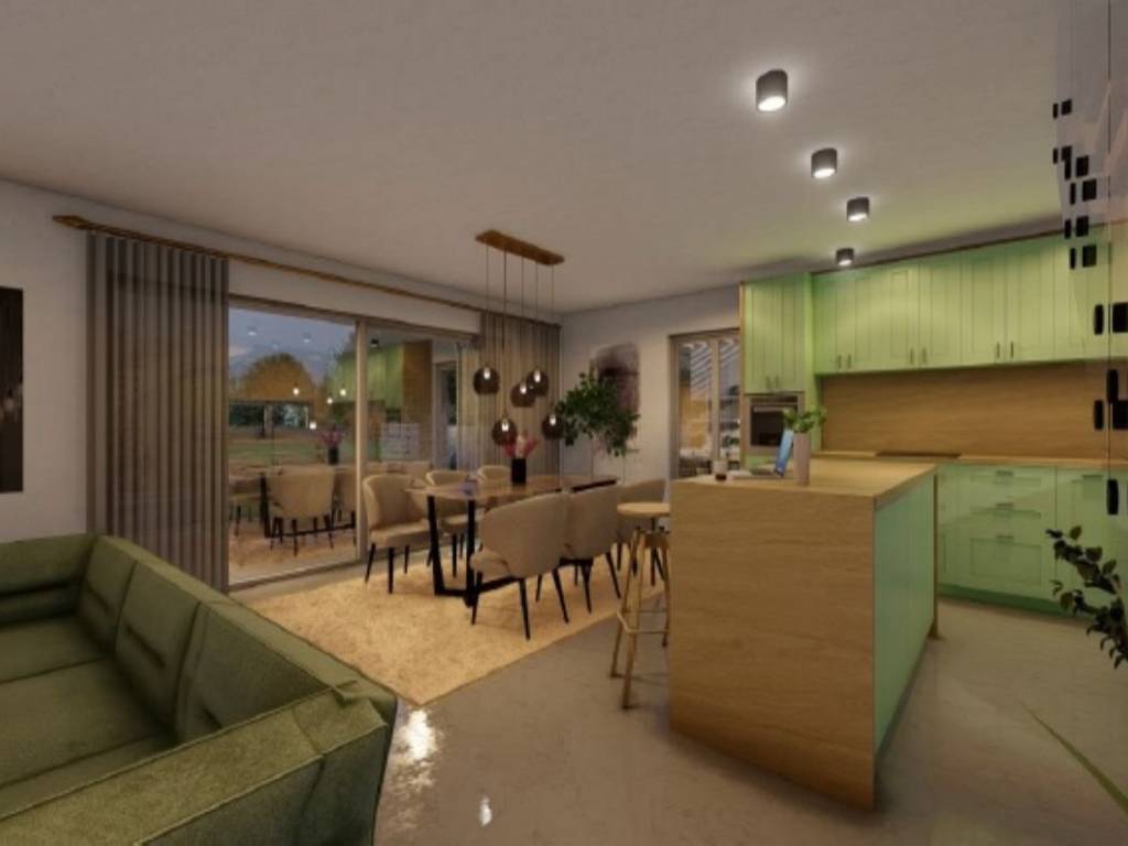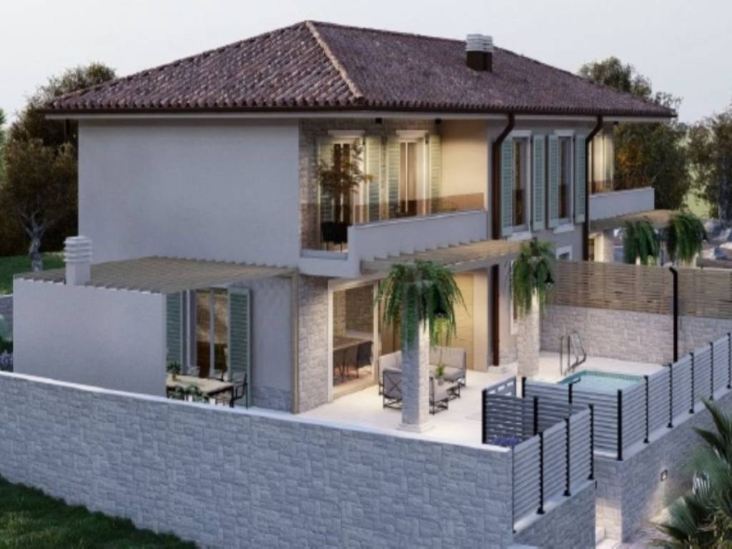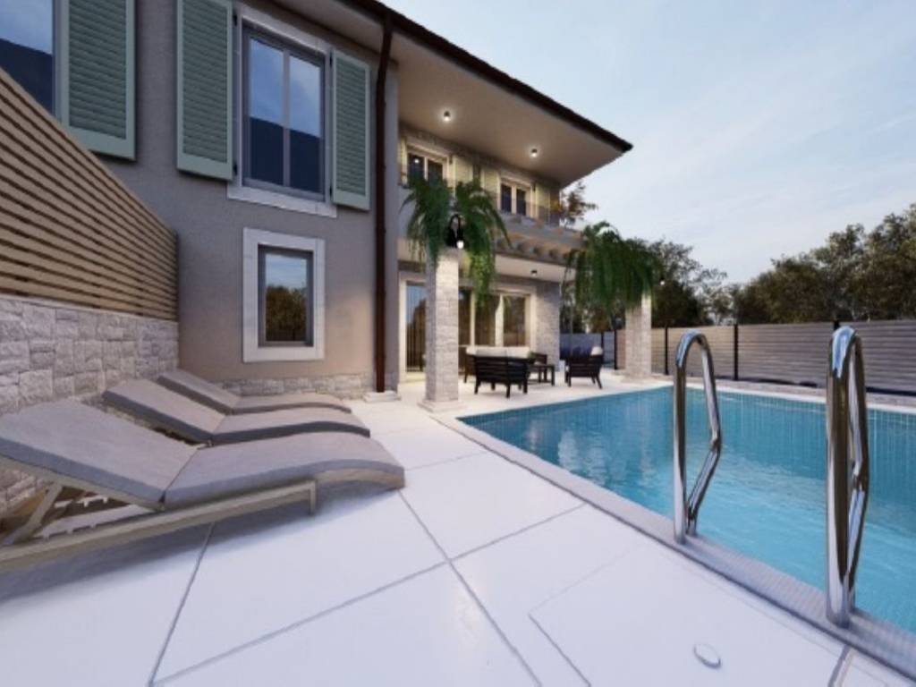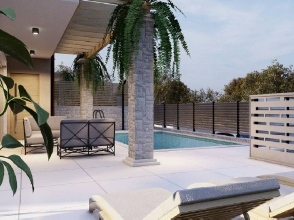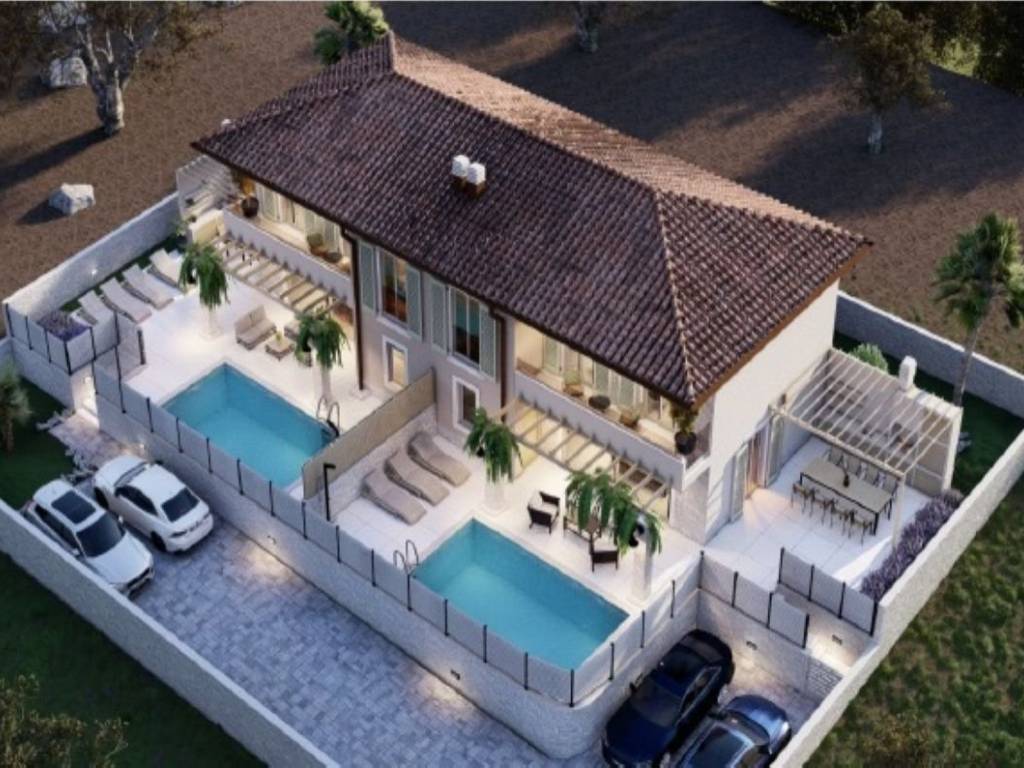 Otok Krk, Malinska, šire područje, prodaja nove dvojne kuće površine 139,69 m2, s bazenom i uređenom okućnicom, na mirnoj lokaciji. Kuća se sastoji od prizemlja s dnevnom sobom s kuhinjom i blagovaonom, toaletom i terasom te prvog kata s tri spavaće sobe, tri kupaonice i balkonom. Kvalitetna gradnja i oprema, klimatizacija, dva parkirna mjesta. Udaljenost od mora i centra 700 m.
