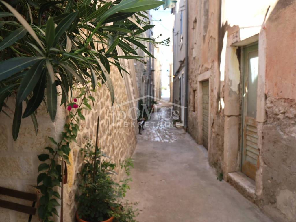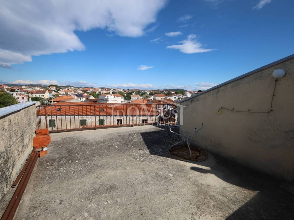 Pirovac – authentic terraced house in the heart of Pirovac, just 20 meters from the waterfront and the sea. The total usable area of the house is 91 m², spread over five levels: ground floor, first, second, and third floors, plus a rooftop terrace with views of the sea, the marina, and the old town of Pirovac. The ground floor consists of a kitchen with dining area, a storage room, and a bathroom. Interior stairs lead to the first floor, where one bedroom is located. The second floor, also accessible via interior stairs, contains the second bedroom. Further interior stairs lead to the third floor with a third bedroom, from where the stairs continue to the spacious rooftop terrace offering open views of the sea and town center. The house is ready to move in but requires renovation. The inter-floor construction is made of wooden beams, and the joinery is wooden. Parking is available on public spaces approximately 140 meters from the house.