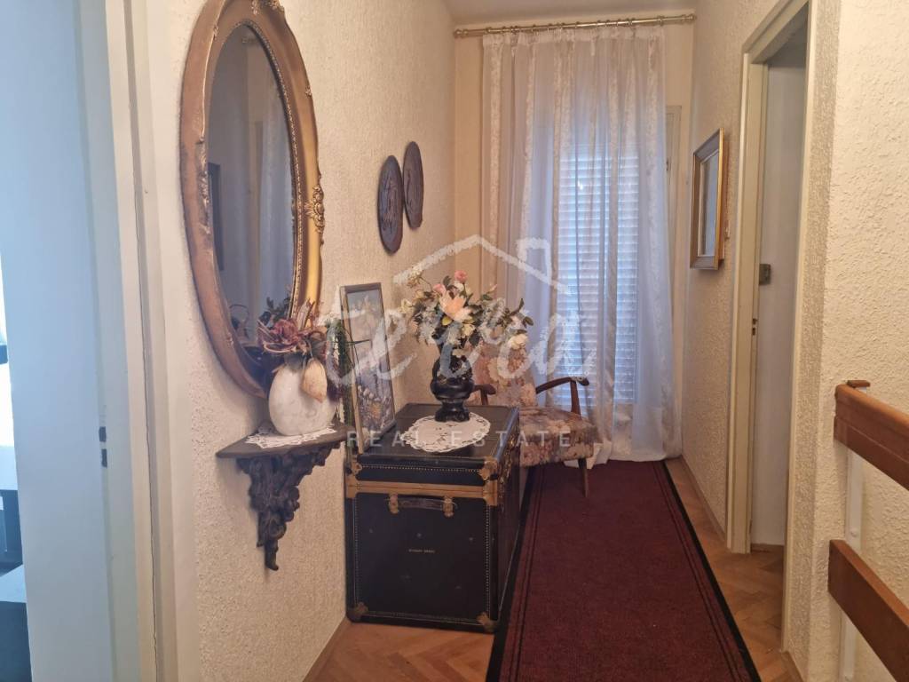 The first floor has a separate entrance from the outside, external stairs. On the first floor there is a large living room, kitchen, dining room, bedroom with balconies, bathroom, hallway, glazed veranda, and a larger terrace with barbecue. On the second floor there are four bedrooms (two with balconies), bathroom and hallway.