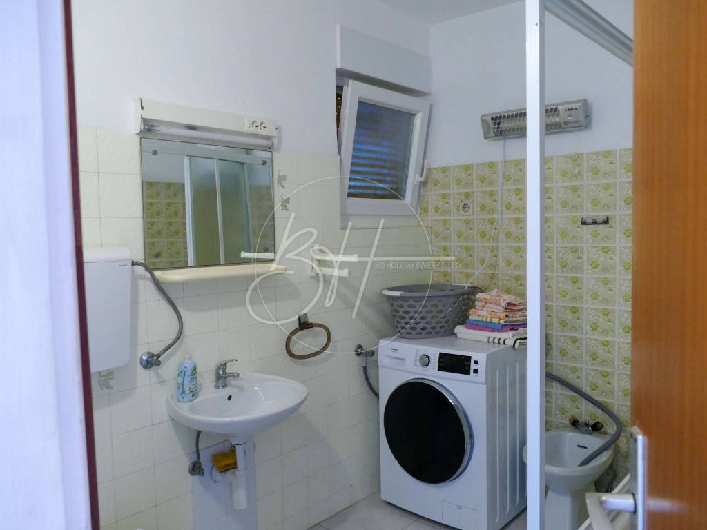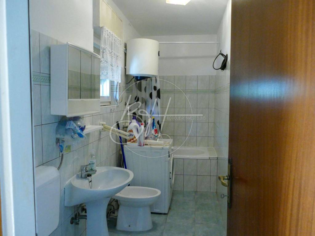 The first floor consists of a hallway, kitchen with dining room and living room, two bedrooms, bathroom, storage room and a spacious balcony with a beautiful sea view.
