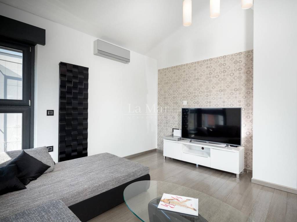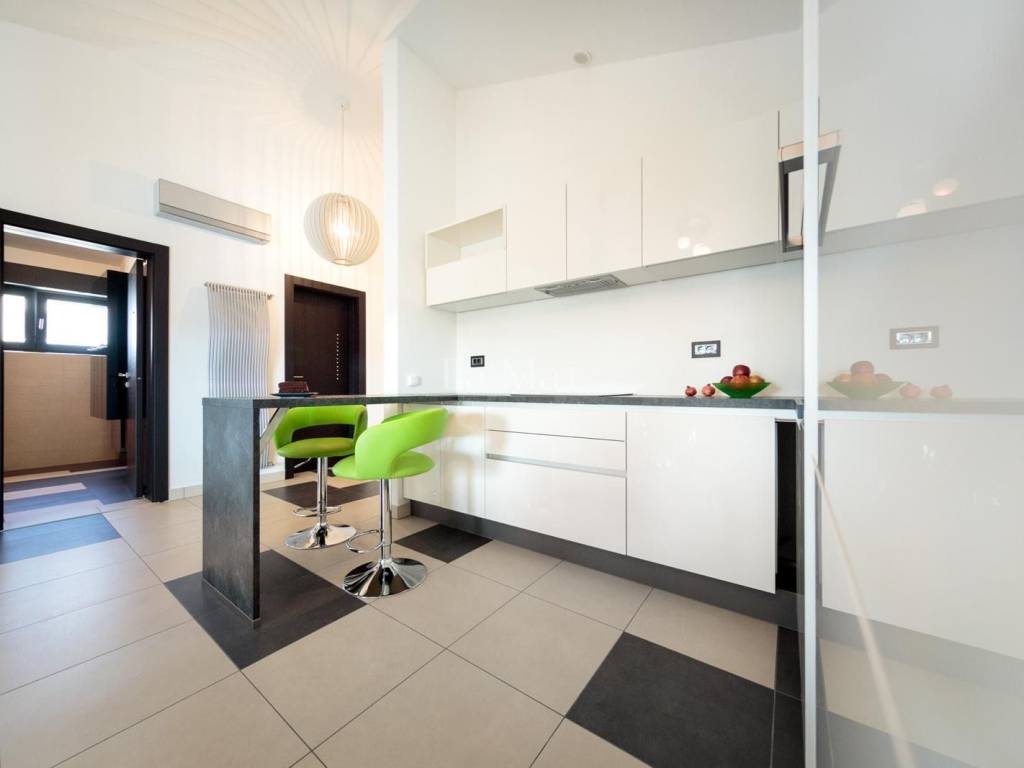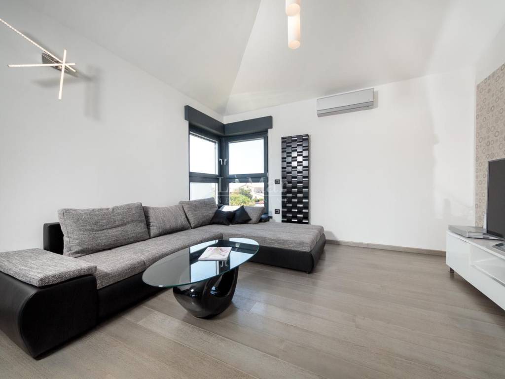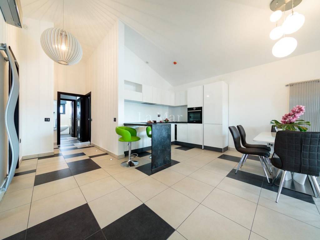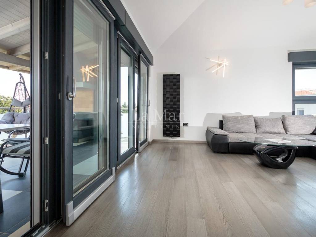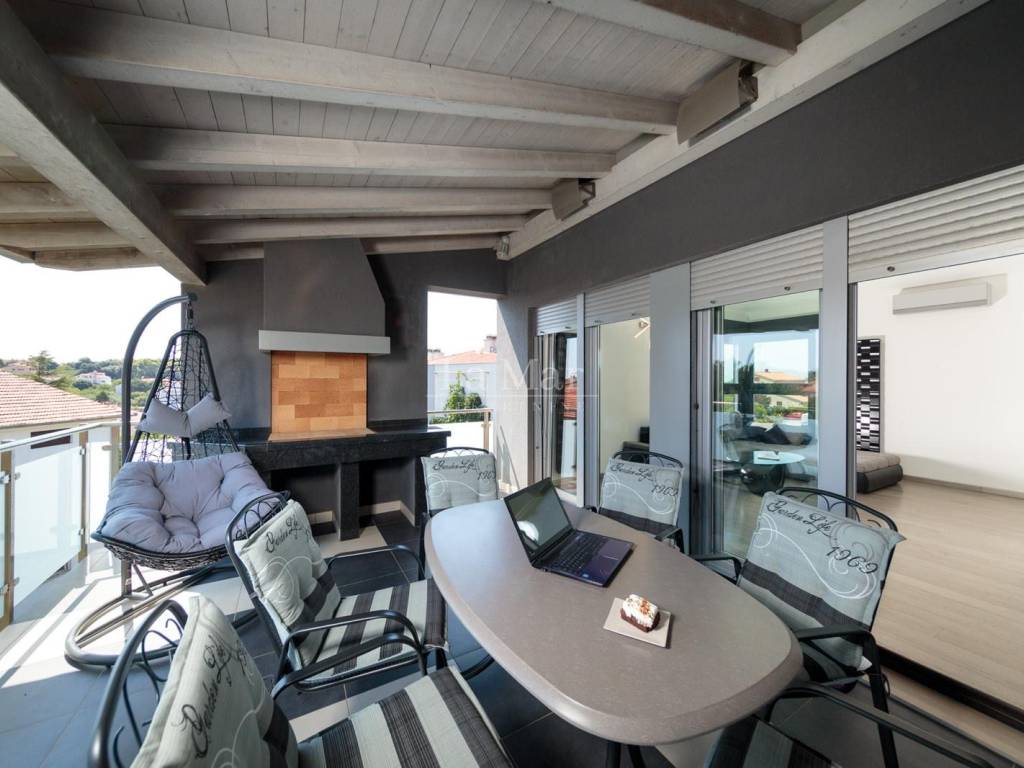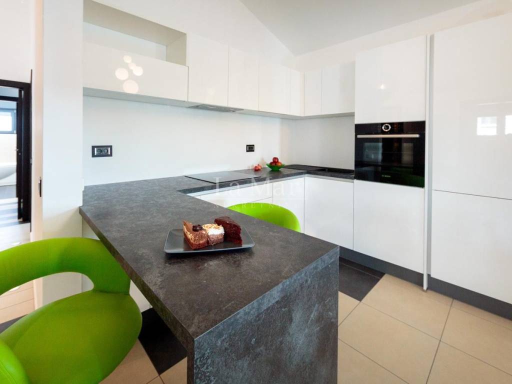 Moderno uređen i opremljen stan sa maksimalno iskorištenim prostorom pruža ugođaj za život. Stan ima veliku količinu prirodnog svijetla, kuhinja je potpuno opremljena a iz dnevnog boravka izlazi se na prostranu natkrivenu terasu gdje se nalazi roštilj. U dvije velike prostrane kupaonice nalazi se vrhunska talijanska keramika. Stolarija je aluminijska.