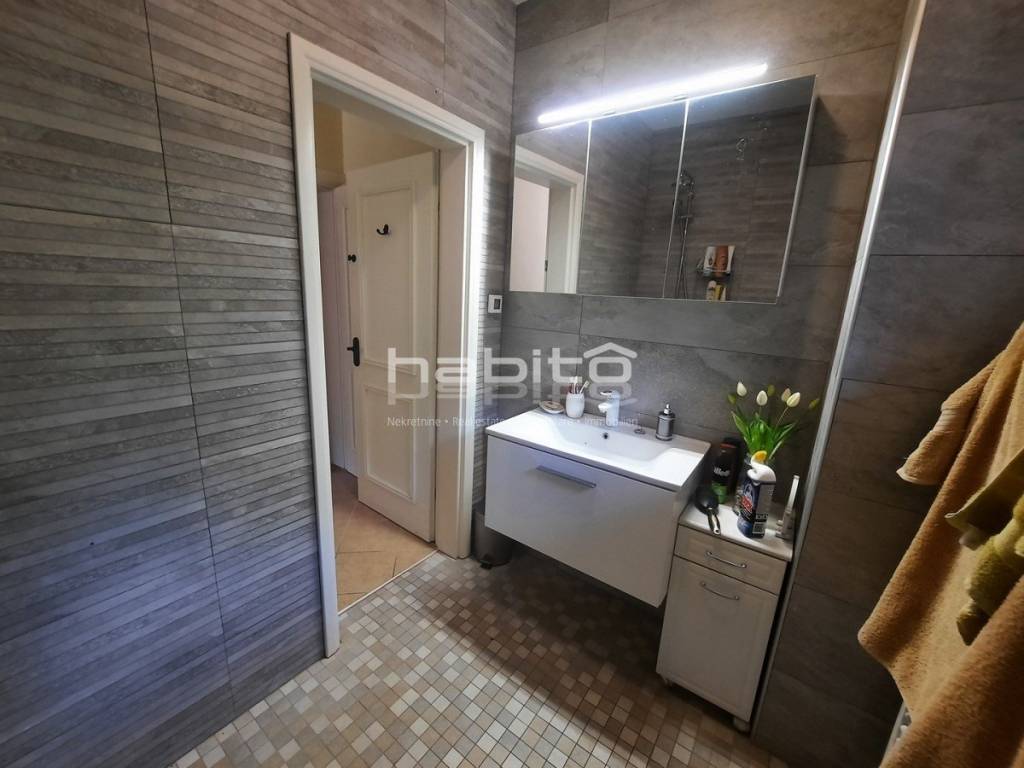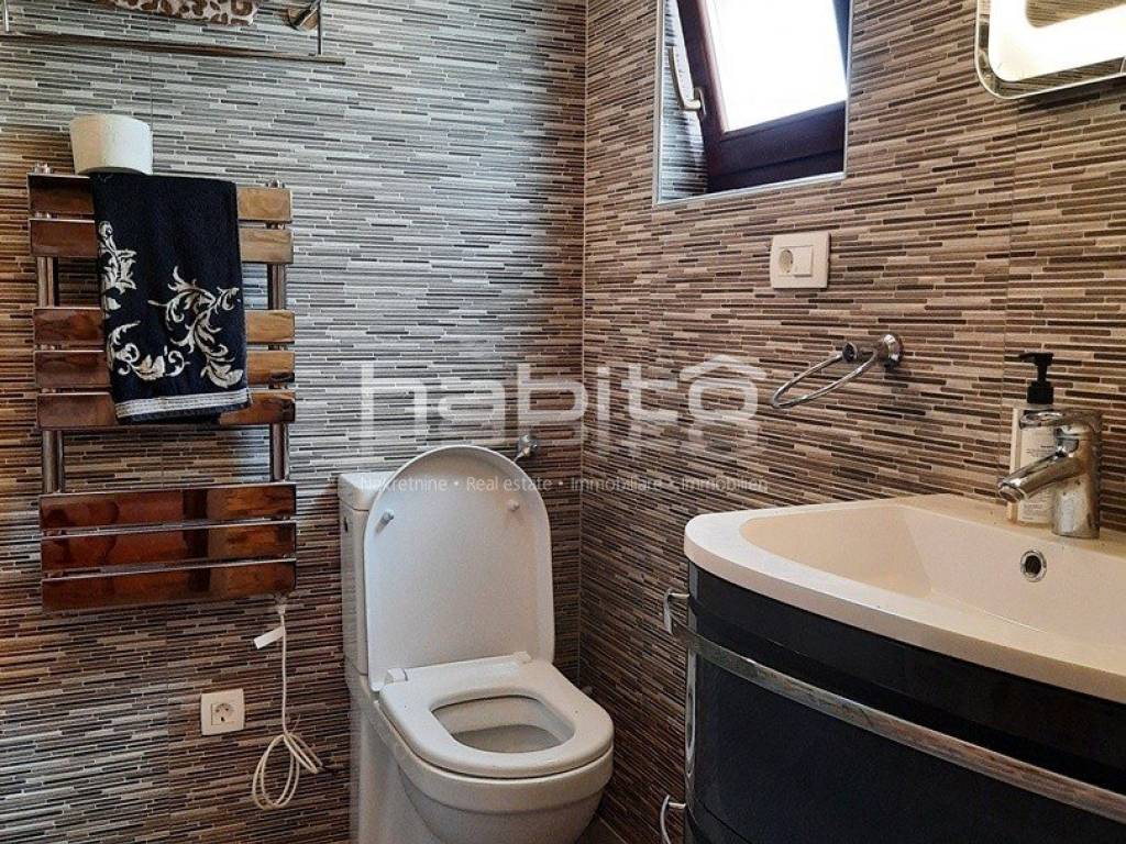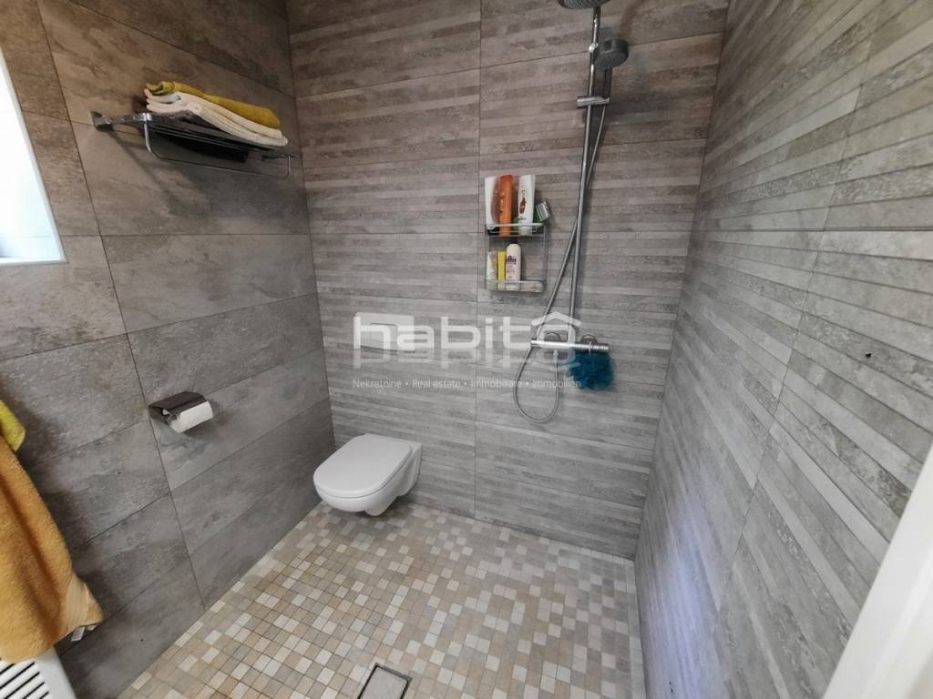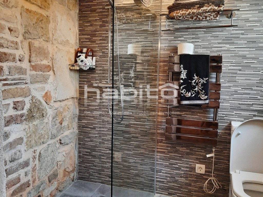 The ground floor of the house contains an entrance hall, a guest toilet, a laundry/storage room, a bedroom with a bathroom, a kitchen, a dining room and a living room with a fireplace and access to a covered terrace.