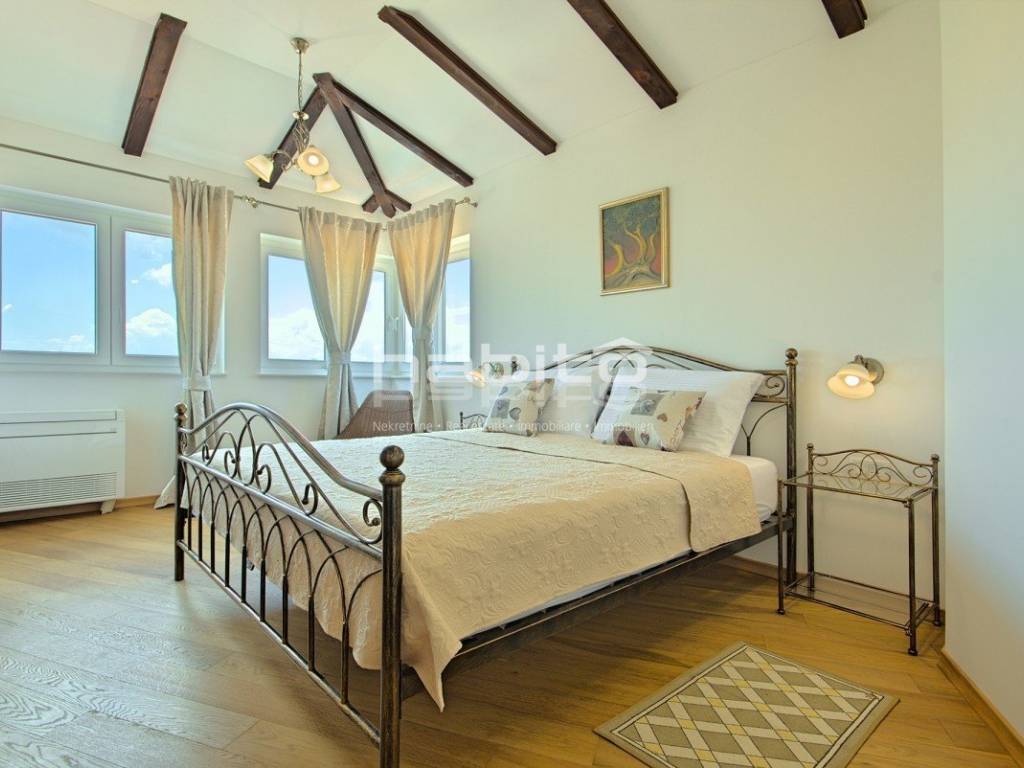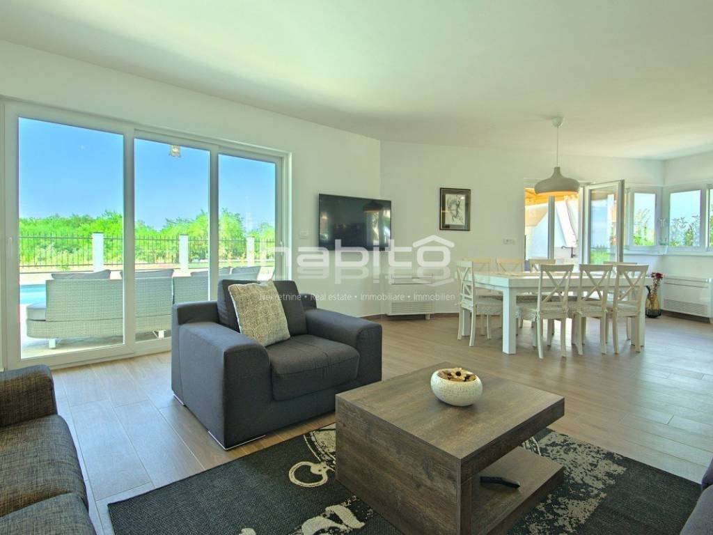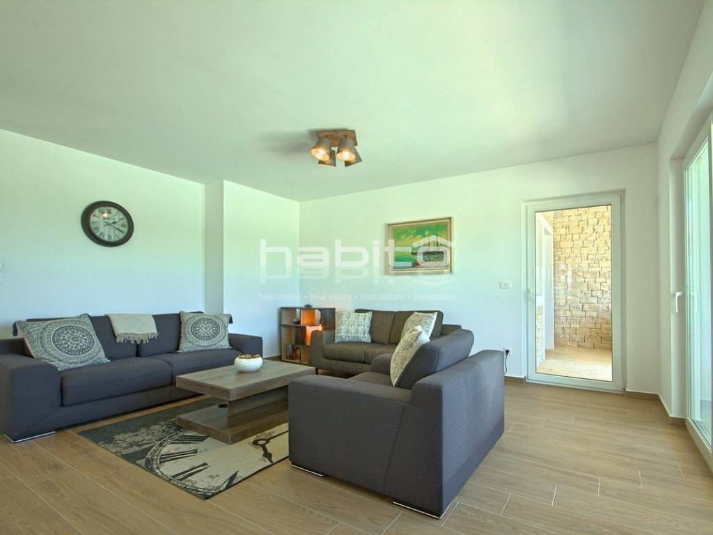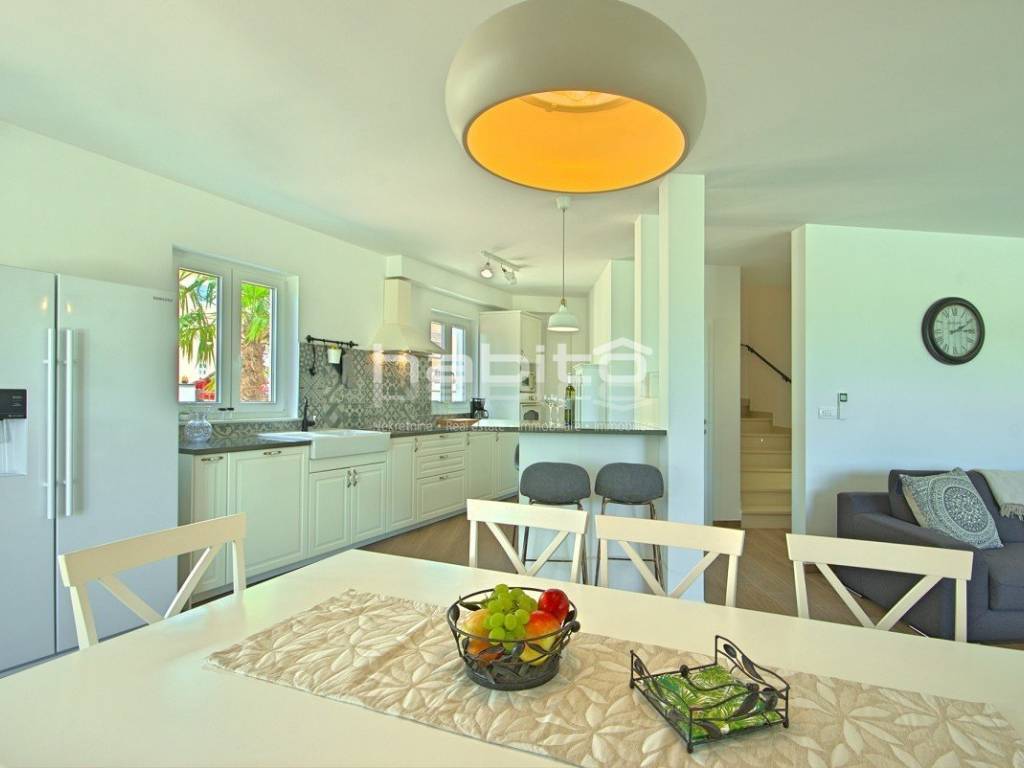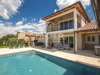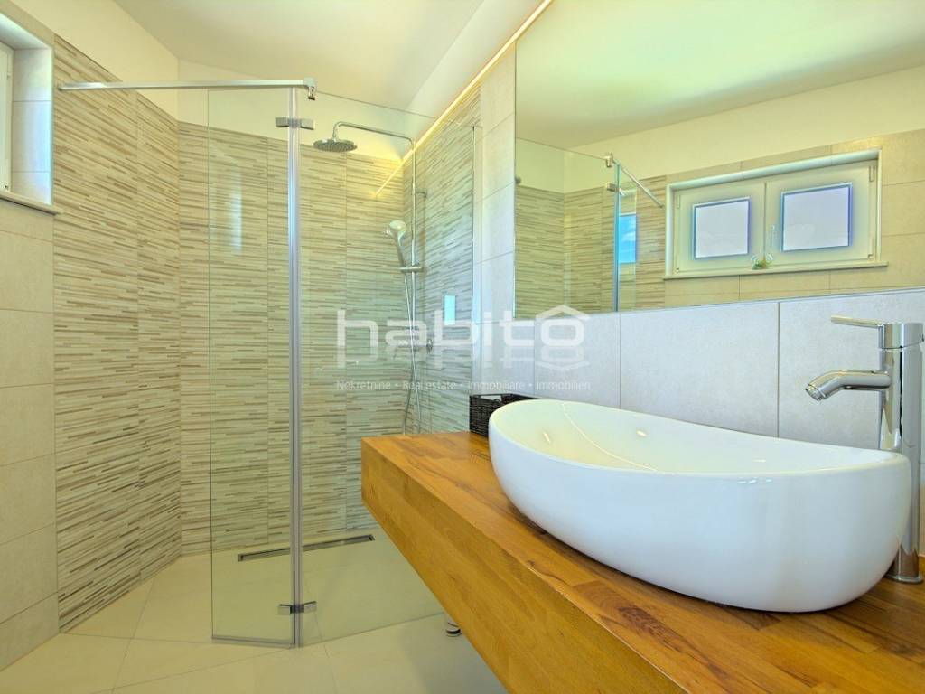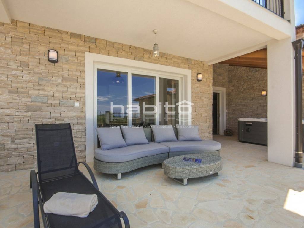 Newly built house of 186 m2 with a plot of approx. 500 m2, located only 5 km from the center of Porec and beautiful beaches. On the ground floor there is an entrance hall, bedroom with bathroom, large kitchen with dining area, living room with access to the garden with the pool. The first floor of the house offers three bedrooms, each with its own bathroom and terrace with a beautiful sea view. The outdoor part of the house consists of a heated pool, outdoor jacuzzi, sauna, additional storage and a covered summer kitchen. Heating and cooling: fan coilers, heating pump.