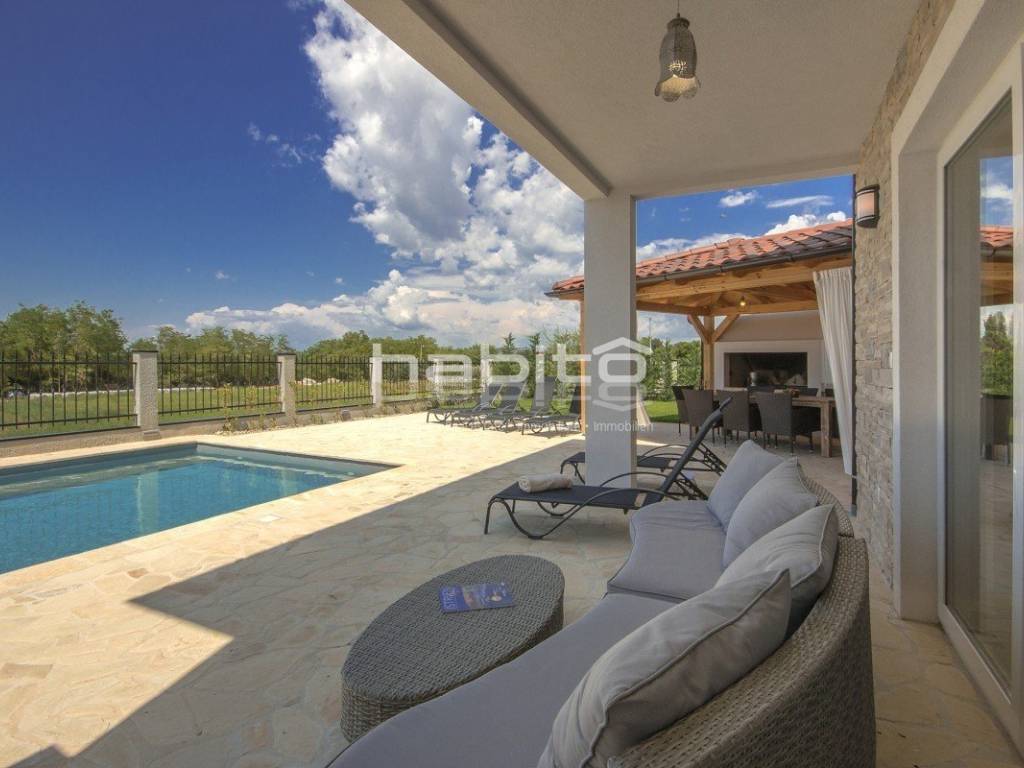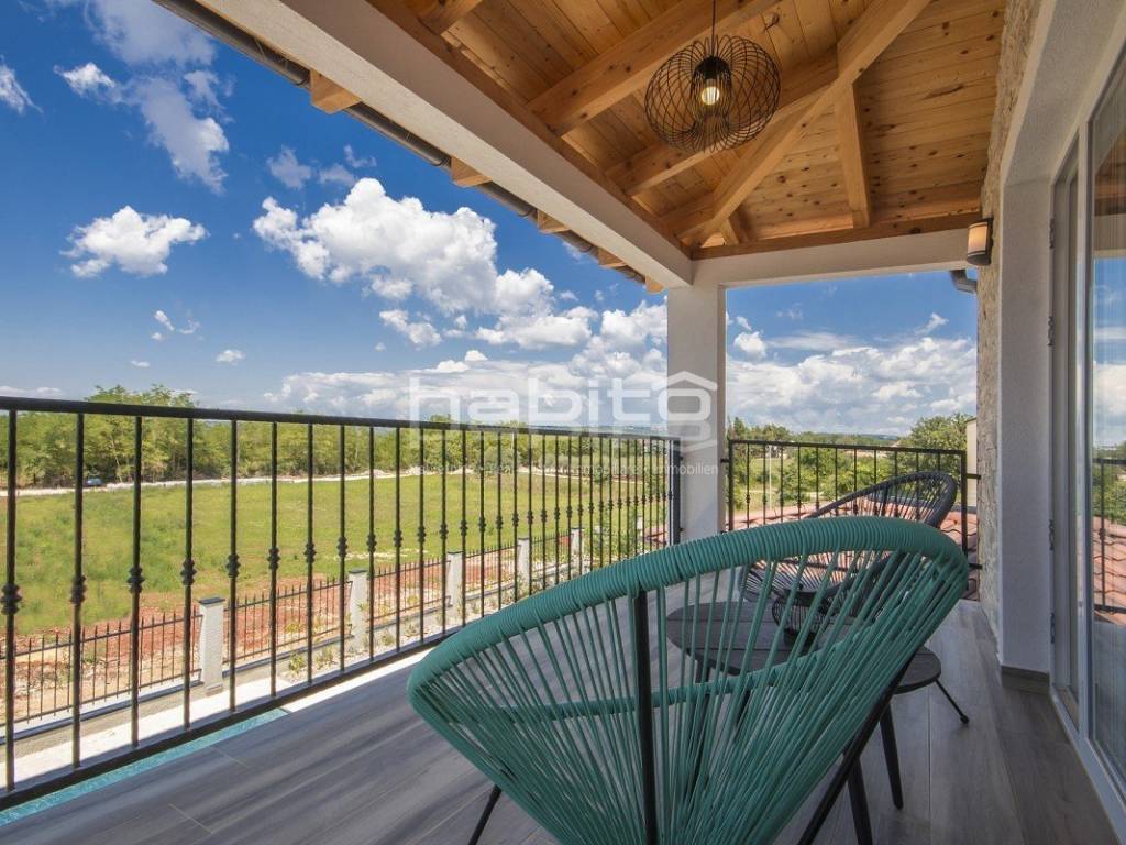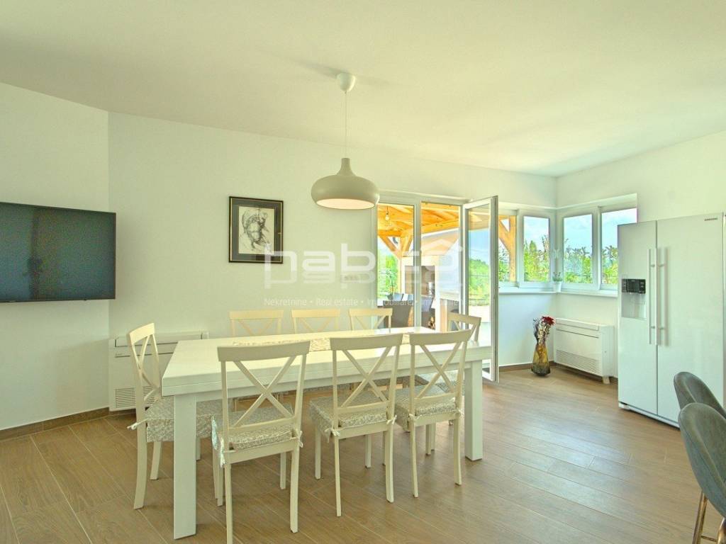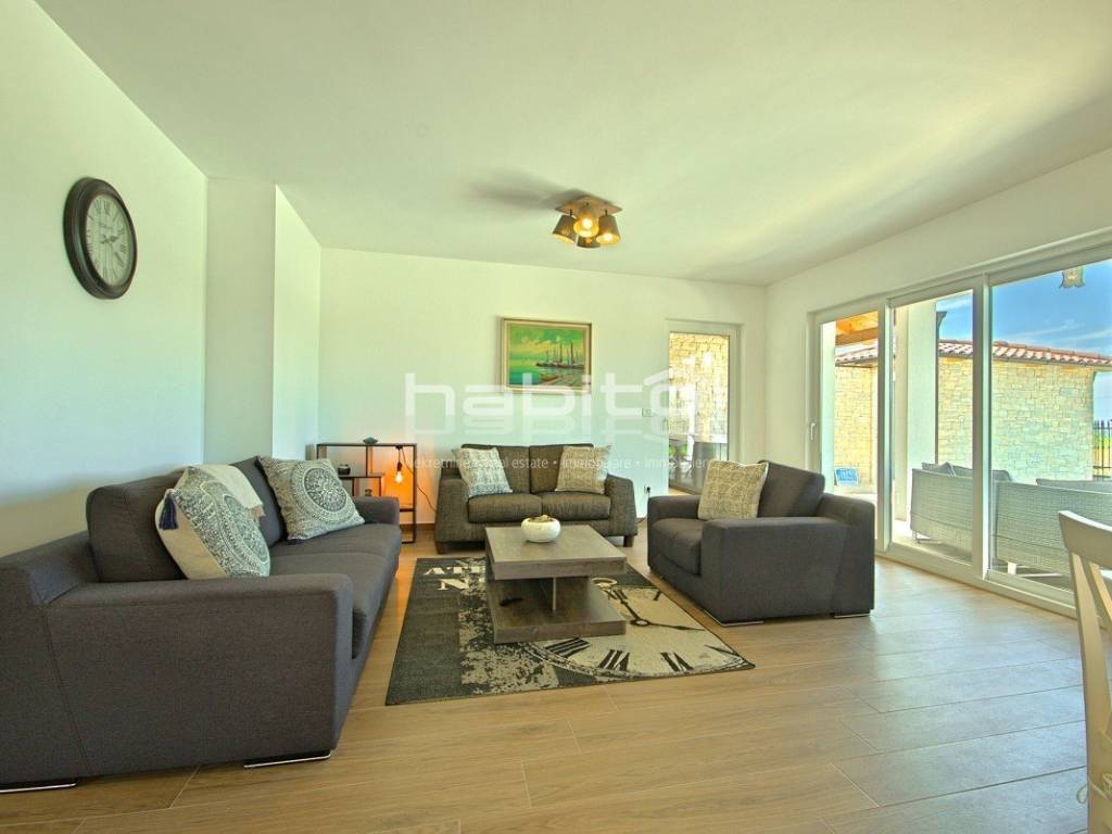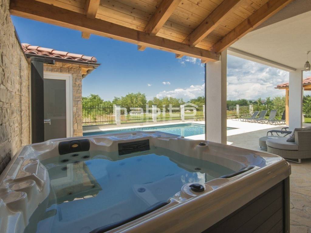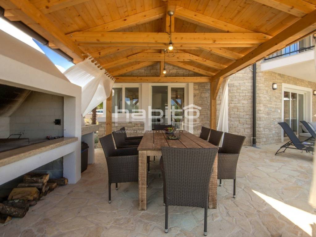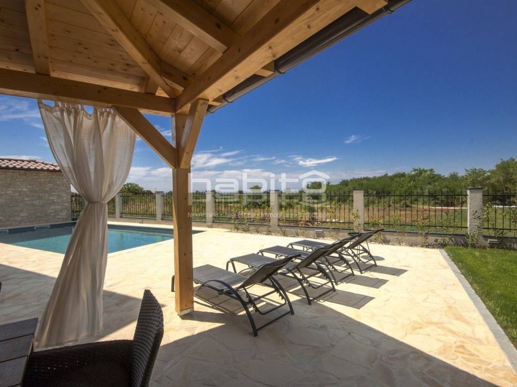 Newly built house of 186 m2 with a plot of approx. 500 m2, located only 5 km from the center of Porec and beautiful beaches. On the ground floor there is an entrance hall, bedroom with bathroom, large kitchen with dining area, living room with access to the garden with the pool. The first floor of the house offers three bedrooms, each with its own bathroom and terrace with a beautiful sea view. The outdoor part of the house consists of a heated pool, outdoor jacuzzi, sauna, additional storage and a covered summer kitchen. Heating and cooling: fan coilers, heating pump.