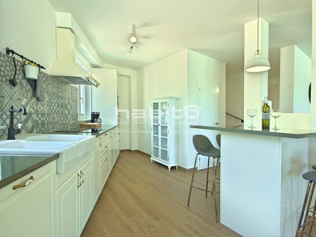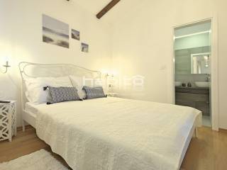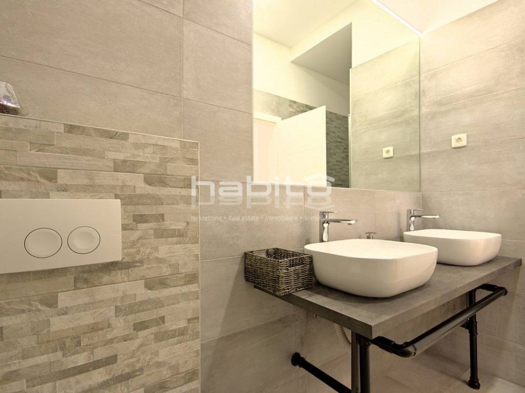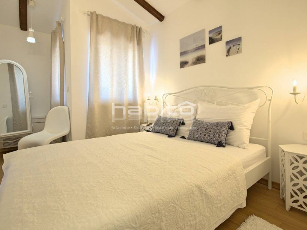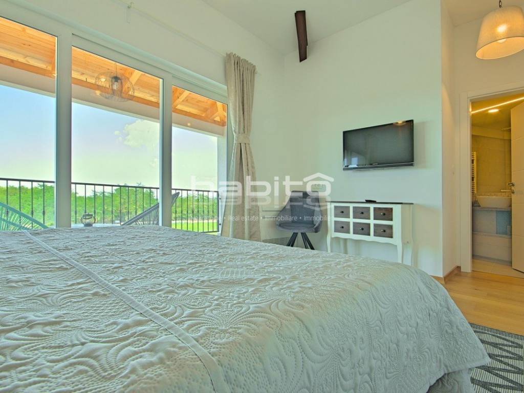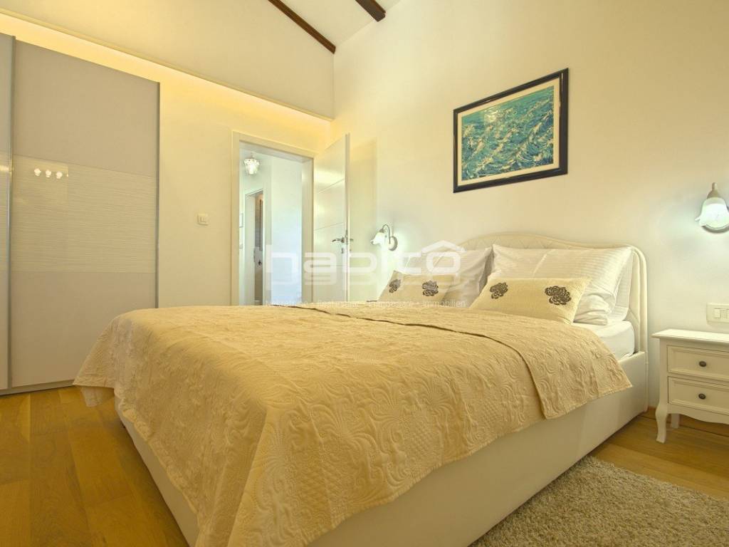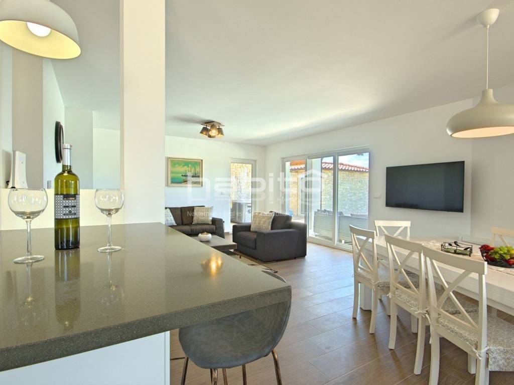 Newly built house of 186 m2 with a plot of approx. 500 m2, located only 5 km from the center of Porec and beautiful beaches. On the ground floor there is an entrance hall, bedroom with bathroom, large kitchen with dining area, living room with access to the garden with the pool. The first floor of the house offers three bedrooms, each with its own bathroom and terrace with a beautiful sea view. The outdoor part of the house consists of a heated pool, outdoor jacuzzi, sauna, additional storage and a covered summer kitchen. Heating and cooling: fan coilers, heating pump.