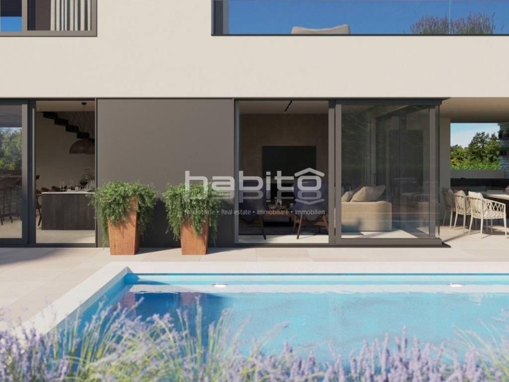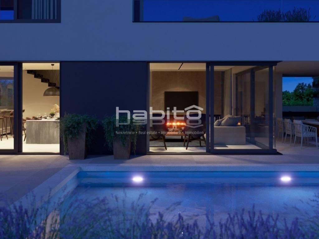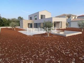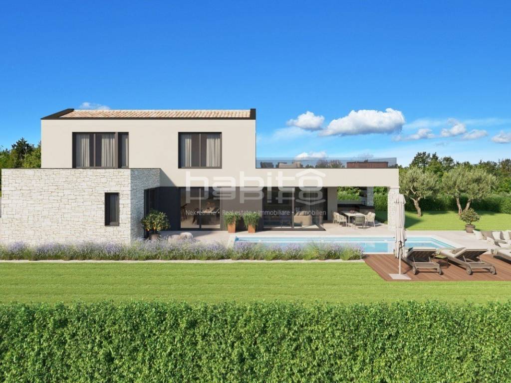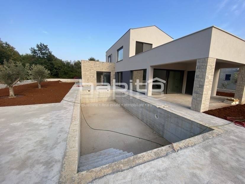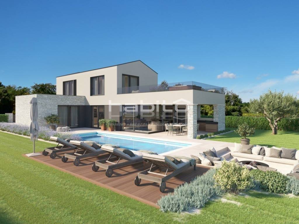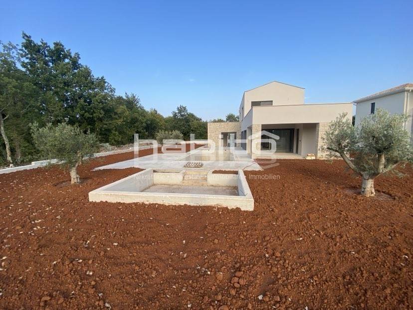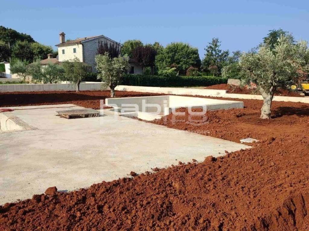 In the quiet and small town only 18 km from Porec, surrounded by pure nature, is located this beautiful villa that is under construction. A villa of 230 m2 gross, i.e. 170 m2 net square footage is being built on a plot of 968 m2. The house consists of a ground floor where there is a storage room, a laundry room, a toilet, a bedroom with its own bathroom, a spacious kitchen and dining room, and a living room. The living room leads to a covered terrace with a summer kitchen and toilet. On the first floor there is one room with its own bathroom and a master bedroom with a bathroom, wardrobe and a spacious terrace that offers a view of the untouched Istrian nature.