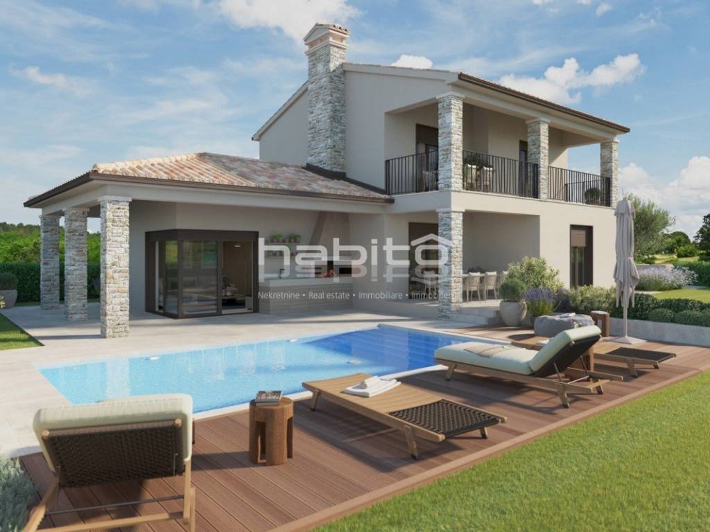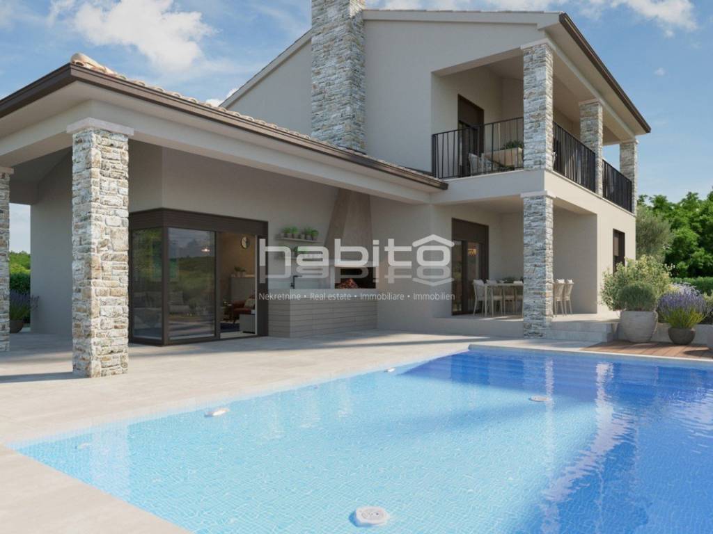 A quiet location near Visnjan. A family house of 165 m on a plot of 555 m with a swimming pool measuring 7x4 m. The house consists of 3 bedrooms, 3 bathrooms, a guest toilet, a utility room, a spacious kitchen with a dining room and a living room with a fireplace. Enjoy the large covered terraces and a spacious yard.