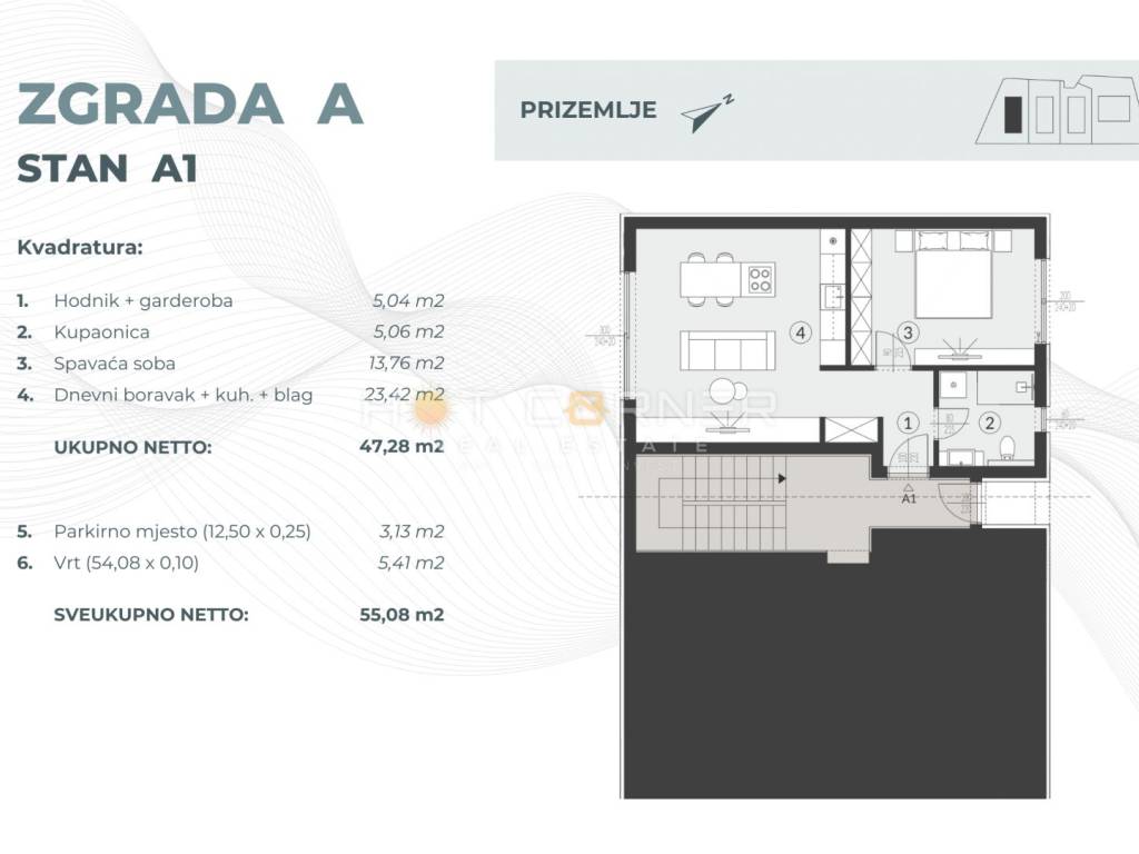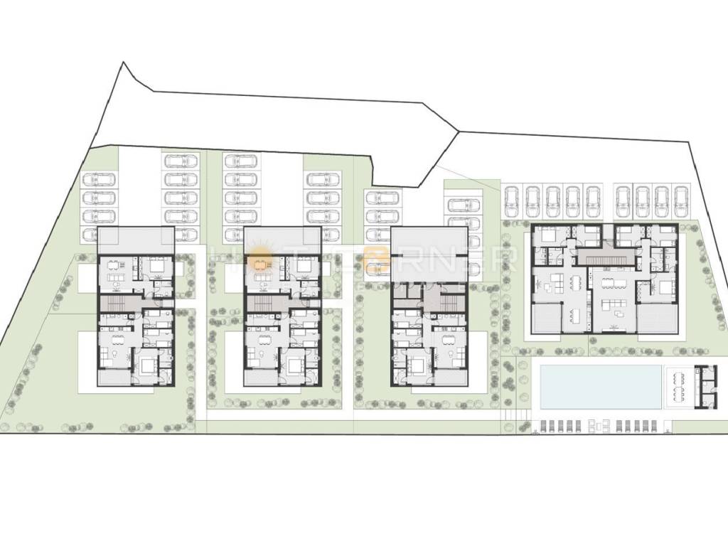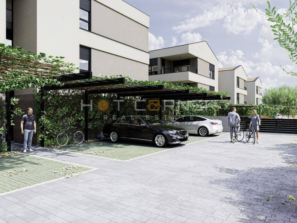and a dining room. The apartment will also have a part of the garden and a communal swimming pool of 85 m2 is planned as part of the project. All buildings have anti-burglary entrance doors with high sound insulation and increased fire resistance, underfloor heating in the bathrooms with the possibility of paying extra for other rooms, three-layer French-type PVC carpentry on all external openings with blinds and mosquito nets, as well as high-quality ceramic tiles throughout the building with the option of choosing your own materials