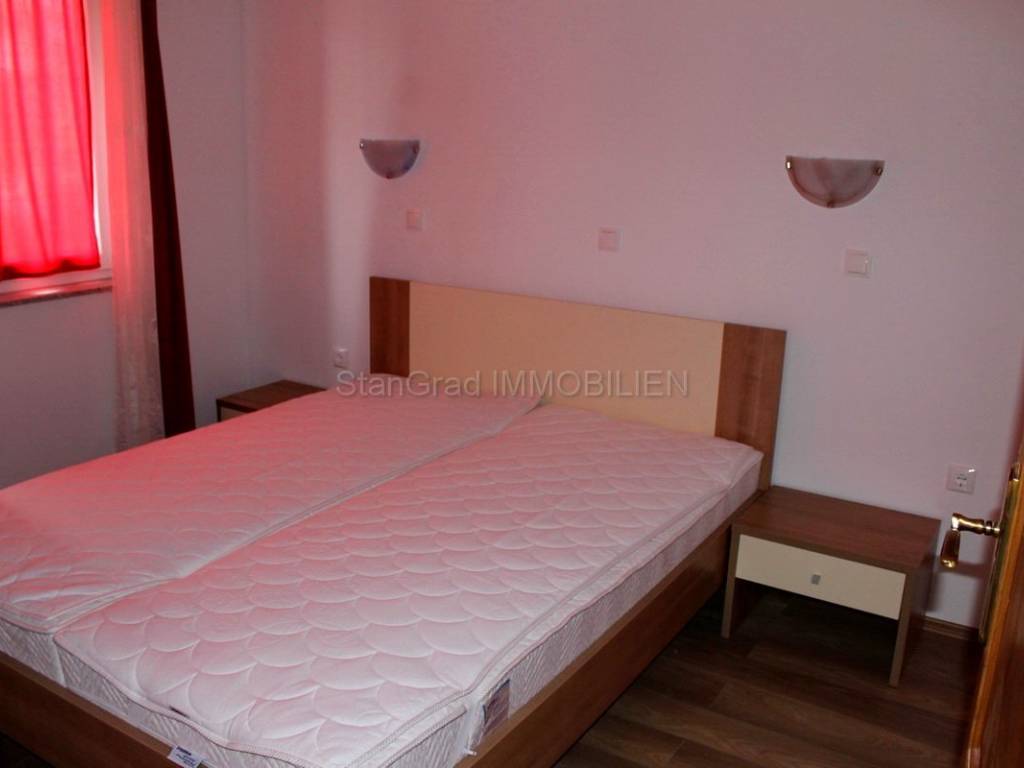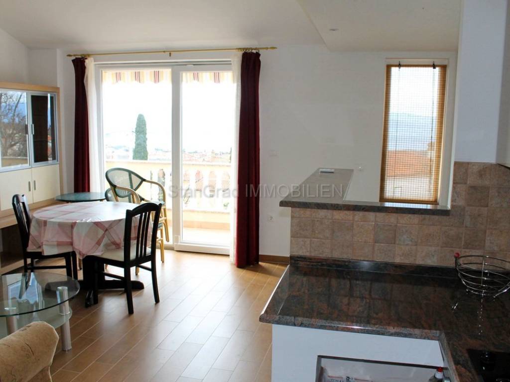 Island Krk, Malinska. The real estates agency Stan Grad Immobilien is offering a new house on the ground floor and the first floor.. The house is fully furnished and contains two living rooms with kitchen and dining area, two bedrooms, two bathrooms, hall, pantry, terrace and balcony. The terrace and the balcony provides a nice view of the sea and Kvarner bay. Two parking spaces and well maintained garden of 30m2 belongs to this property. Property owner ensures proper ownership documents and the real estates agency Stan Grad Immobilien will help you in the transfer of ownership and utility bills.