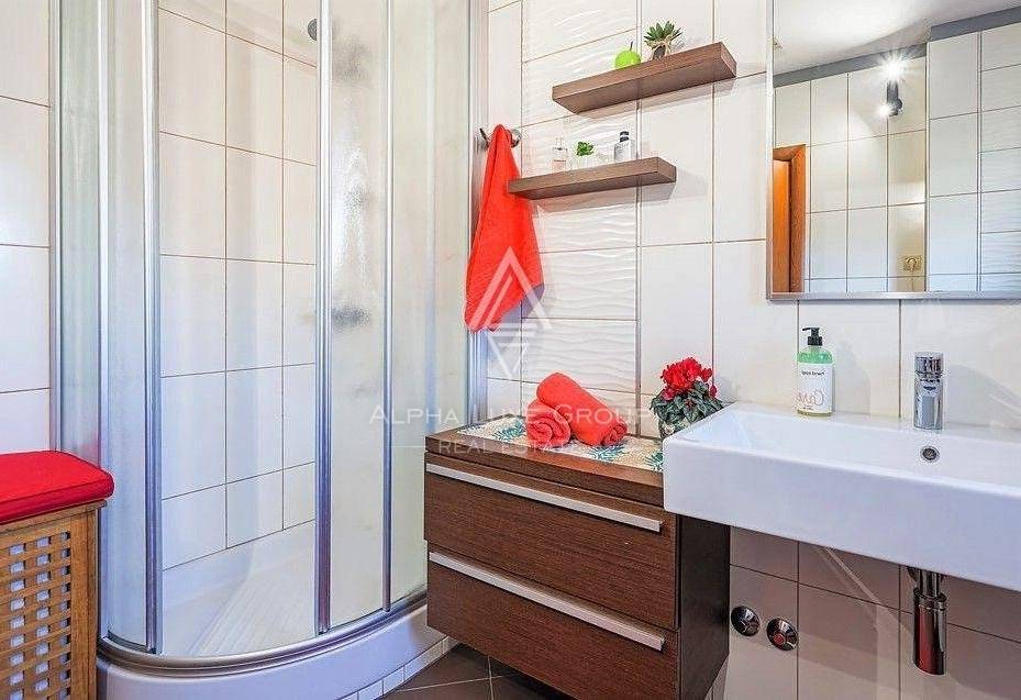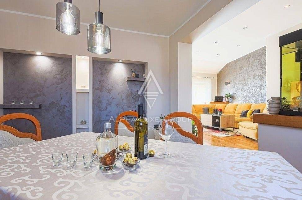 Adjacent to the dwelling is a swimming pool measuring 42 square meters, which boasts a sun deck, an enclosed summer kitchen, and an area for children to play. The outdoor space has been designed with landscaping and fencing.
