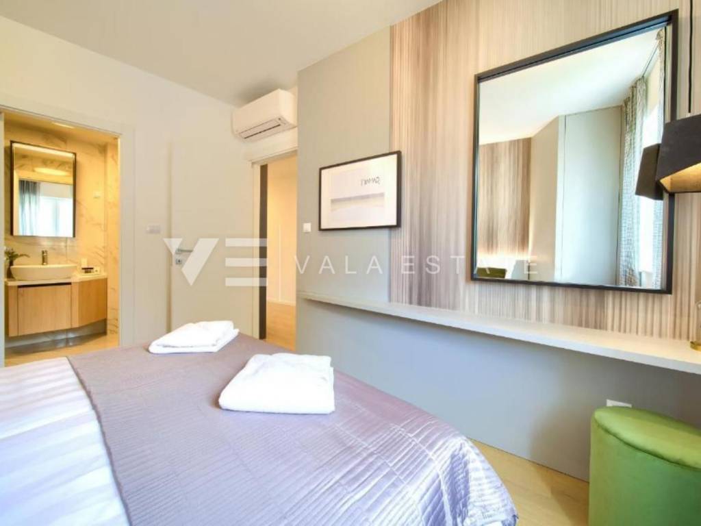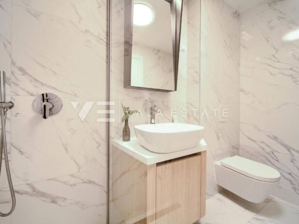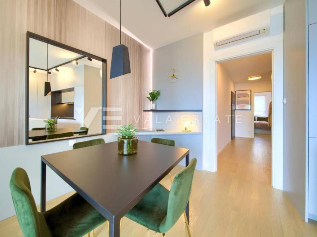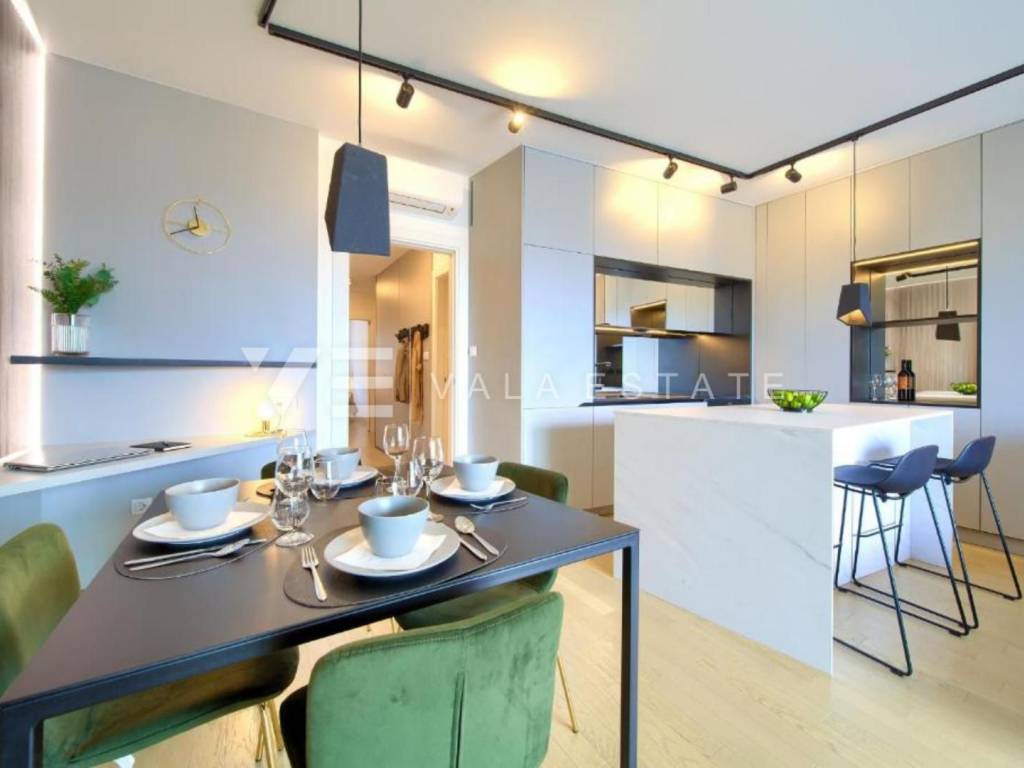 Real estate island of Krk, city of Krk - apartment for sale with a total area of 73.20 m2 on the high ground floor of a newer urban building in a very good location in the city of Krk. The apartment consists of an entrance hall, two bedrooms, two bathrooms, a spacious living room with a kitchen and dining area and a large covered terrace with a beautiful view of the sea and the old town of Krk. High quality construction and equipment, PVC joinery with electric shutters, DAIKIN multisplit cooling/heating system (1 external + internal unit for each room), high-quality parquet floors in the rooms + large-sized 1st class ceramics in the remaining part of the apartment, quality built-in bathroom fittings, wall-hung toilets are just some of the excellent features of this luxury property. It also comes with two parking spaces in the common courtyard of the building. It is being sold fully furnished, has proper documentation and is ready to move in immediately. It is located in a prime location only 700 m from the city center and 800 m from beautiful beaches. An excellent opportunity for housing or as an investment for long-term or tourist rental.