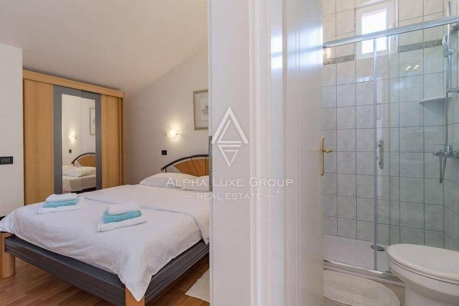 It consists of eight unique apartments with a living area of 550 m2 and a spacious garden of 1,050 m2 with two outdoor swimming pools, a sunbathing area for apartment guests, a covered area for sitting and socializing, beautiful palm trees, a fountain, and benches for enjoying a glass of Istrian wine on warm summer evenings. The villa also has private parking.