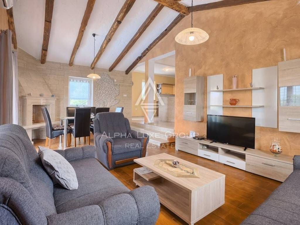 Spanning 145 m2 over two levels, the villa features a spacious ground floor with a living and dining area, an adjoining kitchen with direct access to the yard, one bedroom, a bathroom, and a storage room. The living and dining areas open to a covered terrace, overlooking the pool and manicured garden. Ascend the stone staircase to the first floor, where two additional expansive bedrooms await, one with an ensuite bathroom, alongside another separate bathroom. Air conditioning ensures cool summers, while wall-mounted electric regulators provide heating.