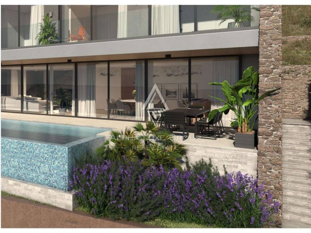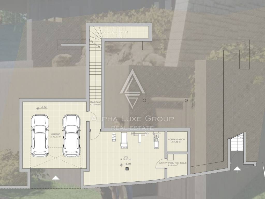 The villa's layout is designed to maximize luxury and space. The basement includes a private parking area for two vehicles. The ground floor features a spacious open-plan living room, dining area, and kitchen, seamlessly connecting to a large terrace and infinity pool with spectacular views. The first floor offers generously sized bedrooms, each equipped with a private wardrobe, including an impressive master bedroom that enhances the sense of comfort and style.