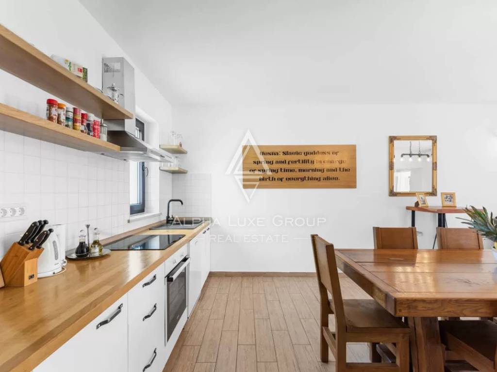 The third villa, although smaller, is built with the same high quality and inviting ambiance. It offers a cozy living room, modern kitchen with dining area and a comfortable bedroom with its own bathroom. Between the second and third villas sits a charming tavern with a fireplace and a separate professional kitchen on a covered winter terrace—ideal for gatherings and culinary experiences.