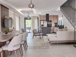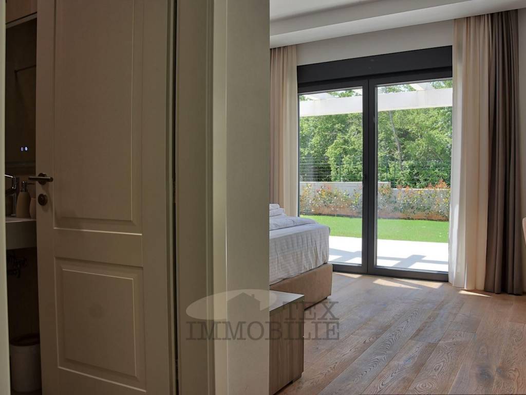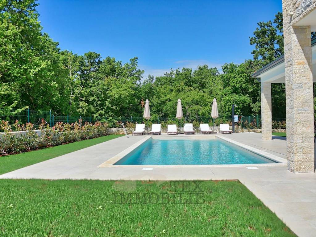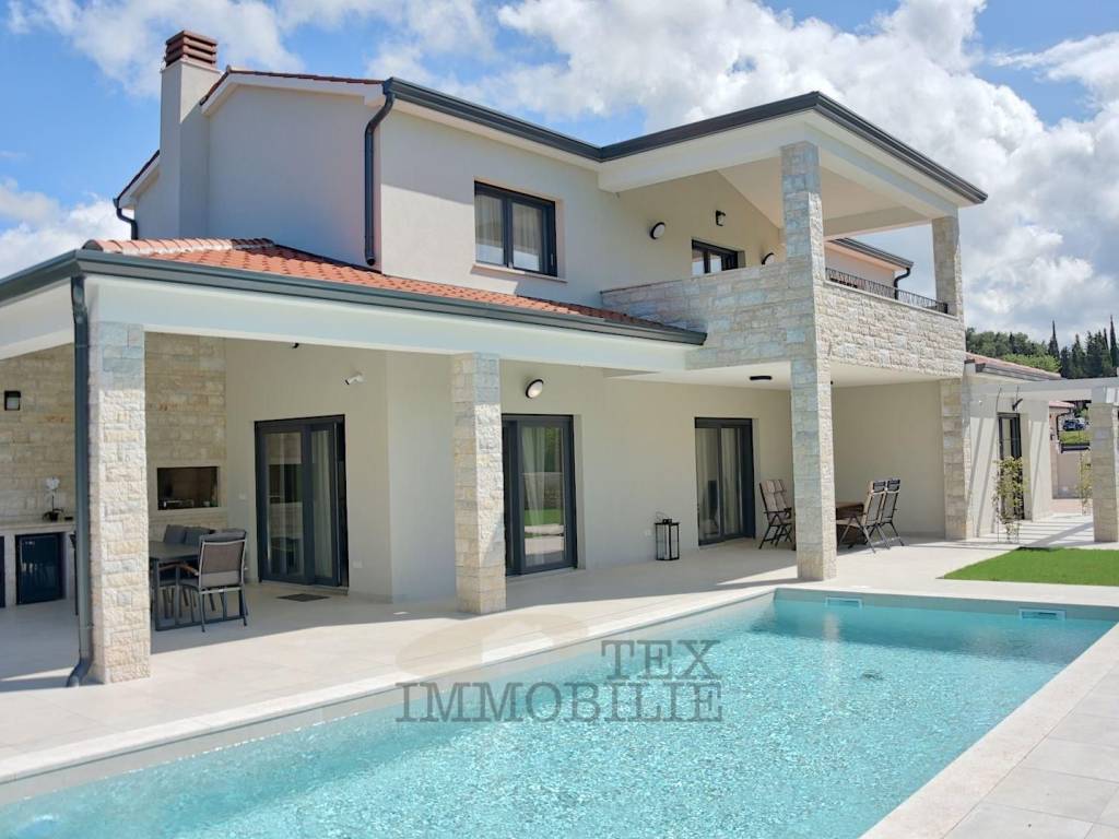 This beautiful modern villa is located in Poreč, just 2 kilometers away from the sea. The villa spans two floors, and the carefully designed layout offers a spacious living space of 218 square meters. On the ground floor, you'll find a kitchen, a living room, and a dining area, a toilet, a utility room, and a bedroom with a bathroom. Upstairs, the villa has three bedrooms, each with its own en-suite bathroom. The master bedroom also features a covered terrace of 17 square meters. To ensure comfort throughout the year, the villa is equipped with a heat pump and fan coil units used for heating and cooling all rooms. There's also underfloor heating in the bathrooms and the living room. The outdoor space includes a spacious 45 square meters net pool area surrounded by a sunbathing area, an attractive outdoor seating area, a covered dining table, a summer kitchen, and a barbecue.