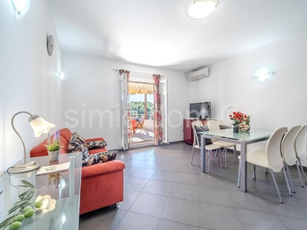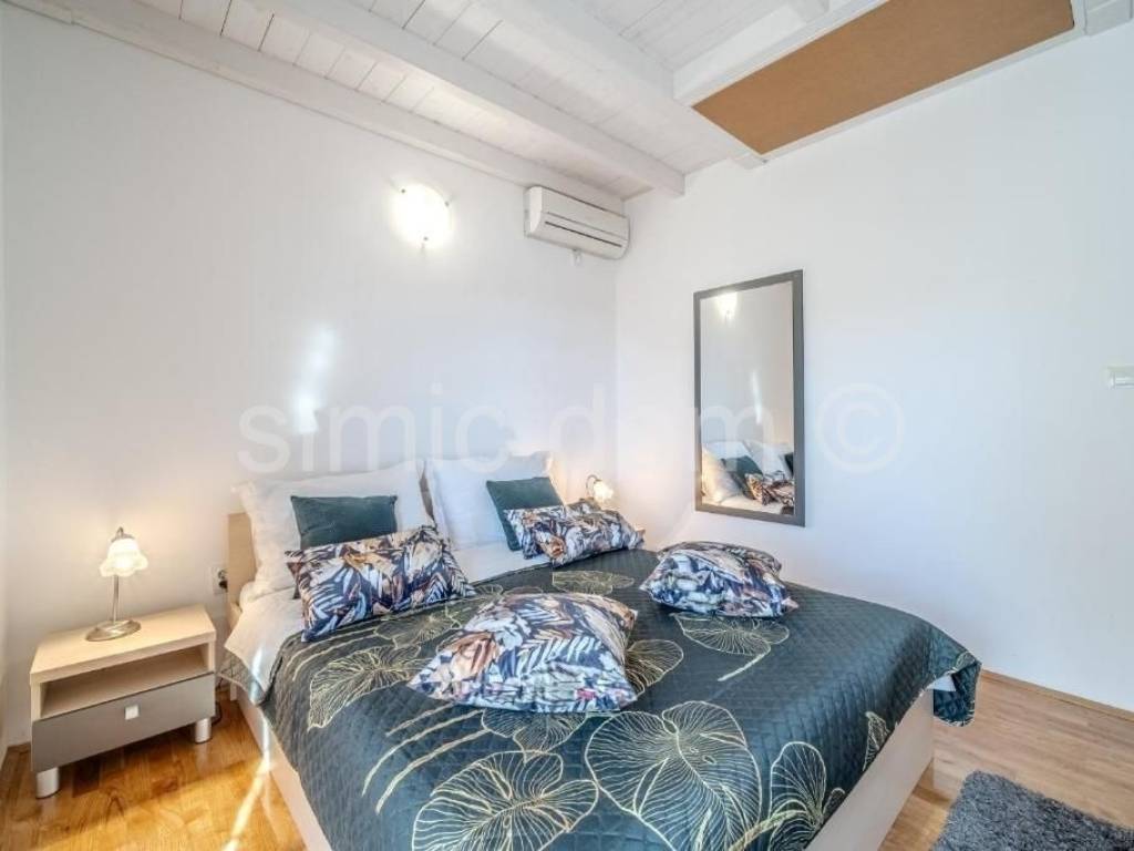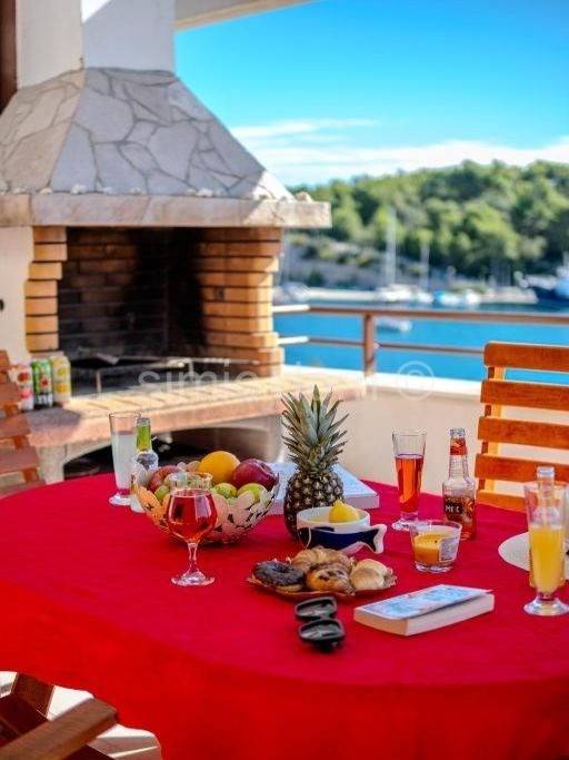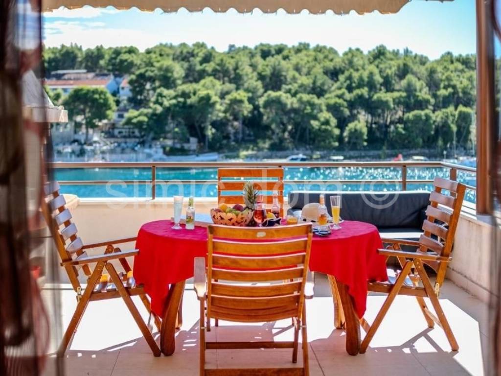 An apartment in the first row to the sea, for sale in Milna on the island of Brac. The apartment is placed on the second floor. It has a total net area of 60.50 m2. It consists of a kitchen with a living room and dining room, two bedrooms and a bathroom. It also has a balcony of 14.70 m2, a yard of 10.60 m2 and a parking space of 11.55 m2. The balcony offers a beautiful panoramic view of the sea. The apartment is fully furnished, decorated and air-conditioned. Ownership is in order.