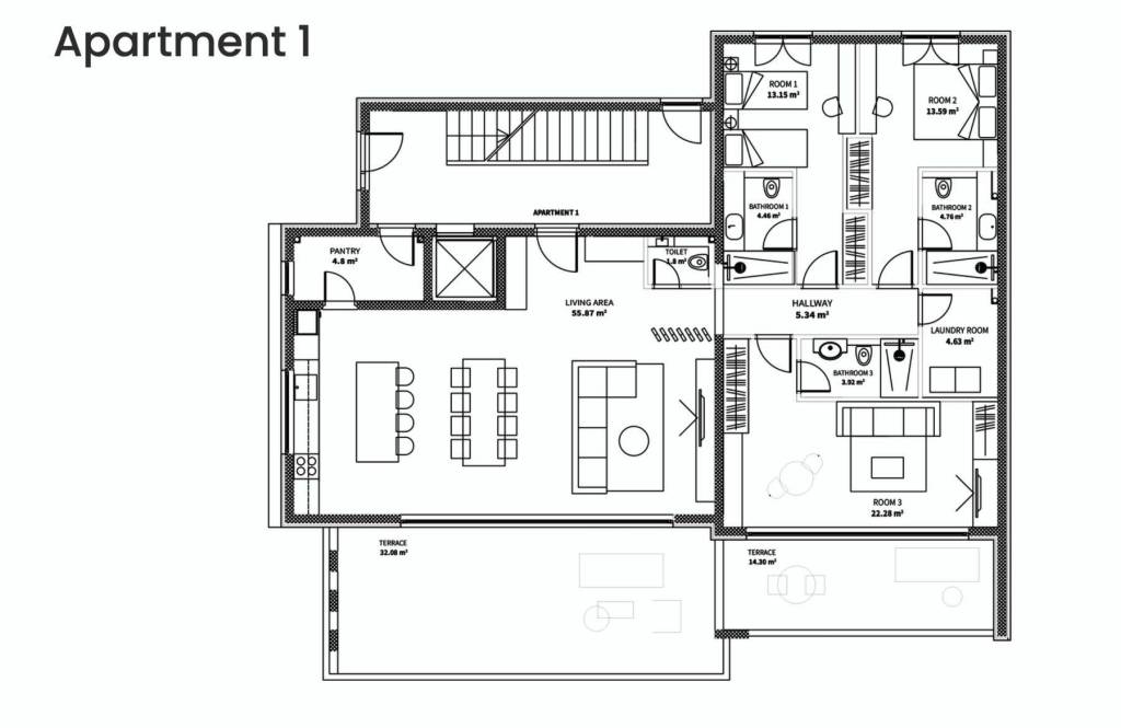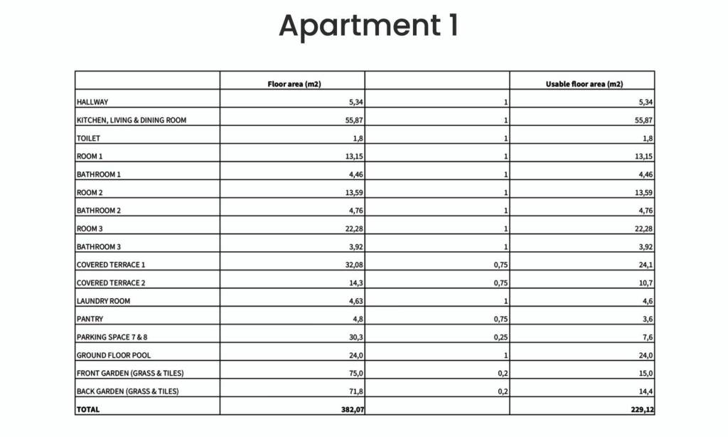Apartment S-1A – ground floor – living area 129.77 m² (3 bedrooms + 3 bathrooms + WC) + 2 covered terraces (46 m²) + pool (24 m²) + front and rear garden (75 + 72 m²) + storage (5 m²) + two outdoor parking spaces no. 7 and 8; net calculated area 229.12 m² = EUR 1,615,000.00