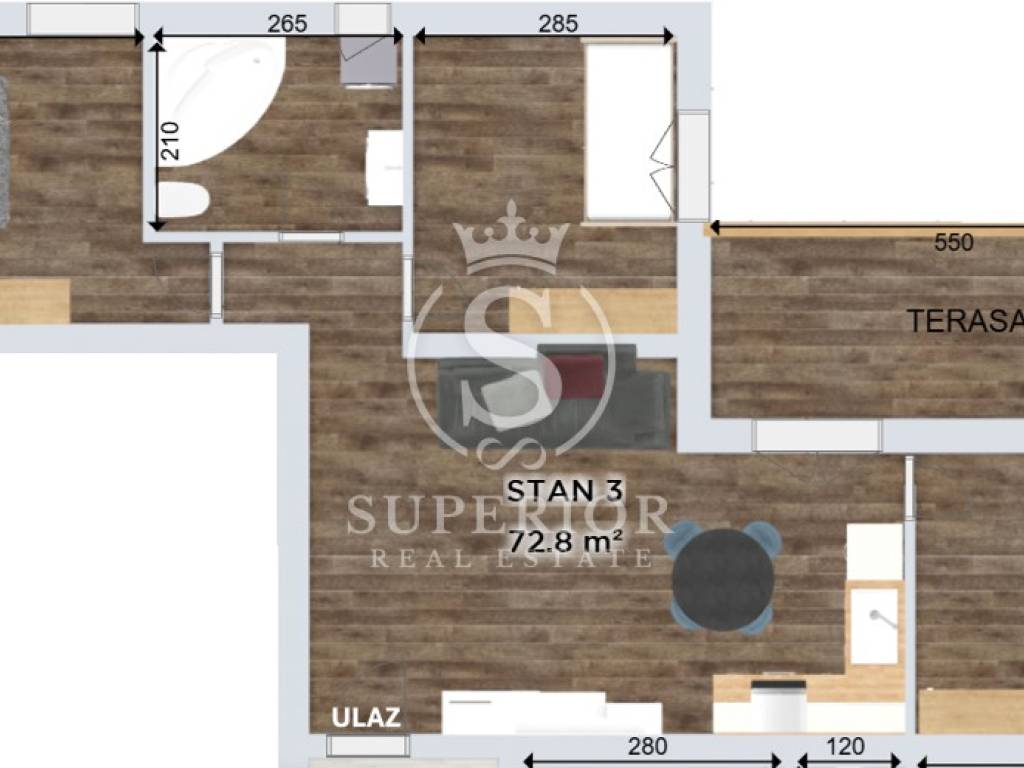The apartment has a living area of 73 m2 and consists of an entrance hall, kitchen with dining area and living room, three bedrooms, a bathroom and a terrace of 11 m2. The space is functionally designed with an emphasis on comfort and a quality layout.