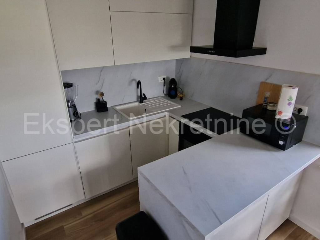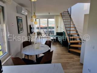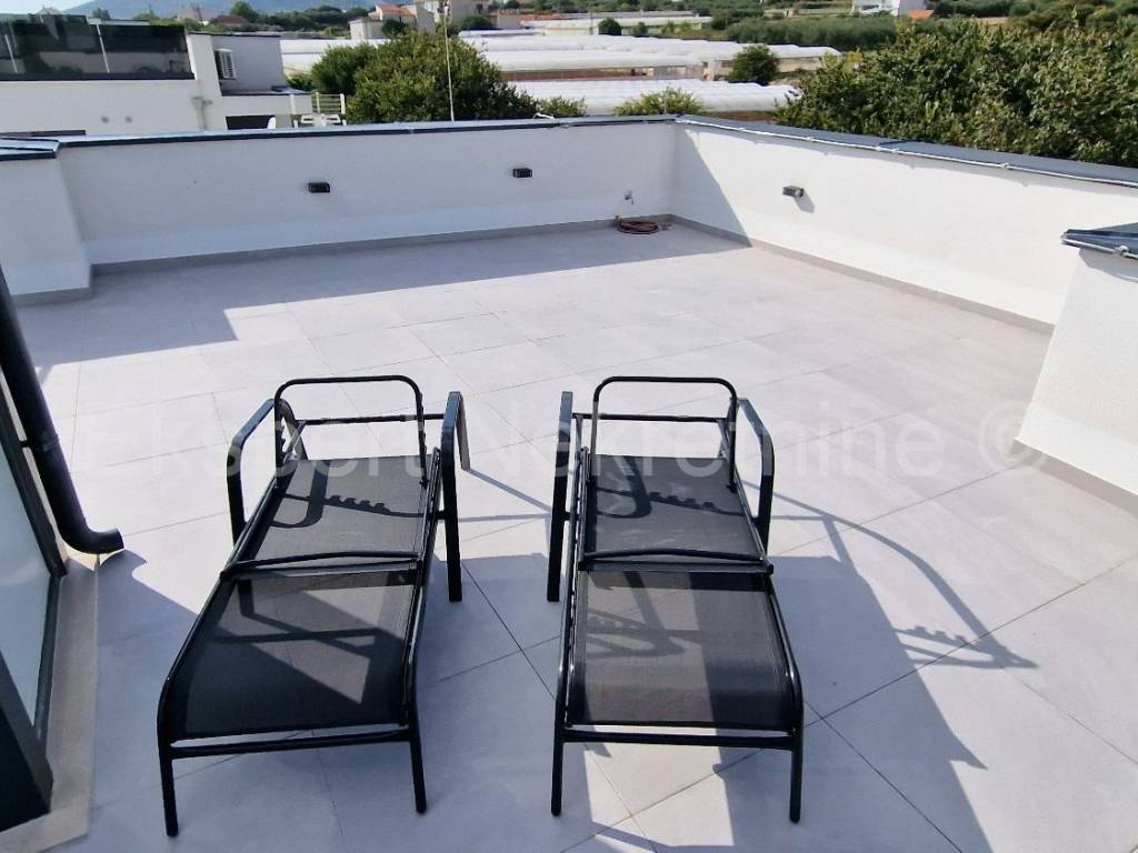 Trogir, luxury penthouse 70 m2 + 75 m2 roof terrace on the second (last) floor of a newer building (2021) with a sea view. The apartment consists of a hallway, two bedrooms, one of which has its own balcony, bathroom, small toilet, kitchen, dining room and living room and a large loggia (15m2) and internal stairs leading to a large roof terrace (75m2) from which there is an unobstructed view of the sea and the surrounding area. The apartment is superbly arranged and fully equipped with new and modern furniture with all appliances. The apartment has underfloor heating, air conditioning in every room, walk-in shower, fully equipped kitchen, quality ceramics and parquet, burglar and fire doors, etc. It also has up to 6 outdoor parking spaces. It is located only 600 m from the sea and beach and 1.2 km from the city center. Quiet location. Good access.For more information, contact the agency.