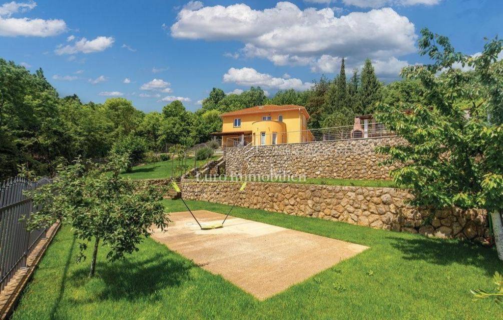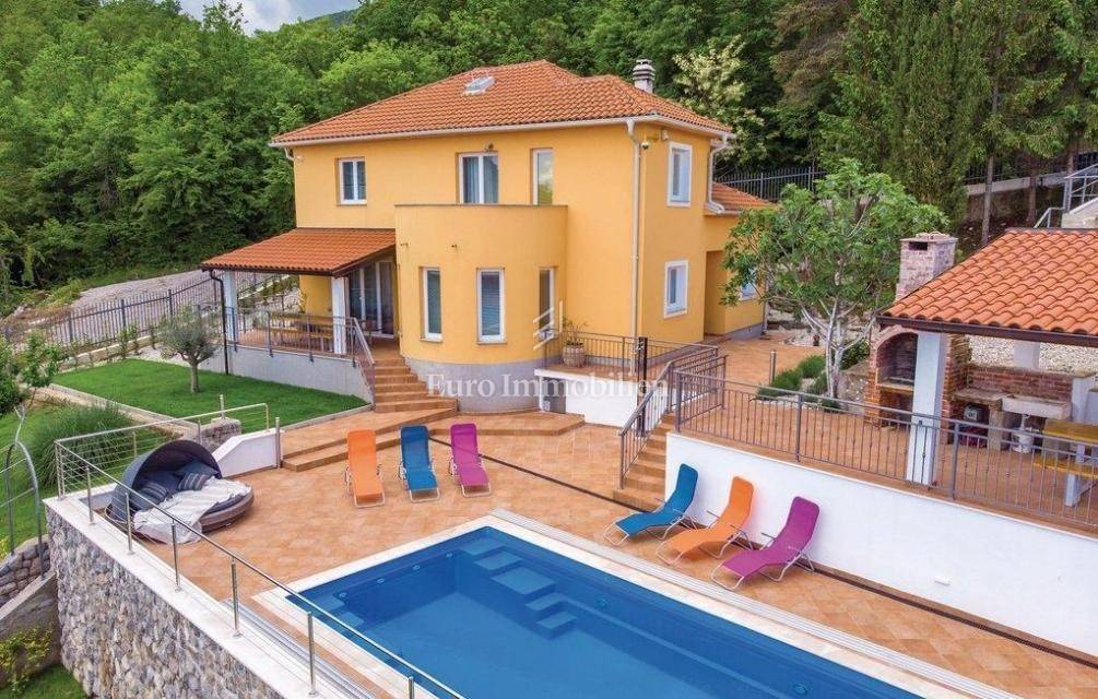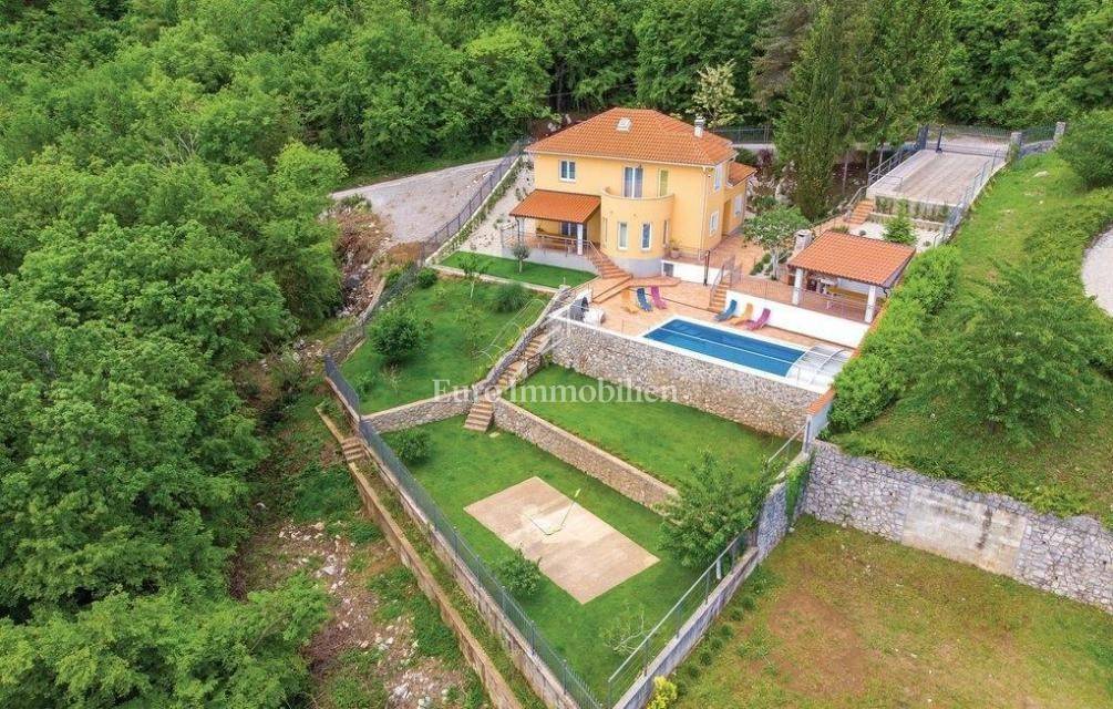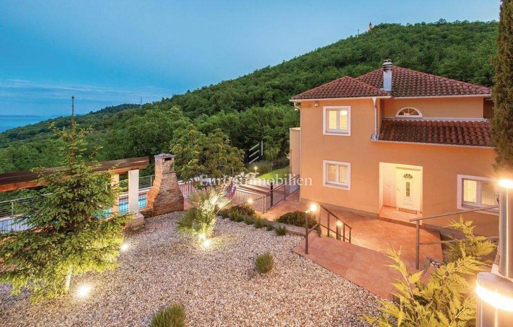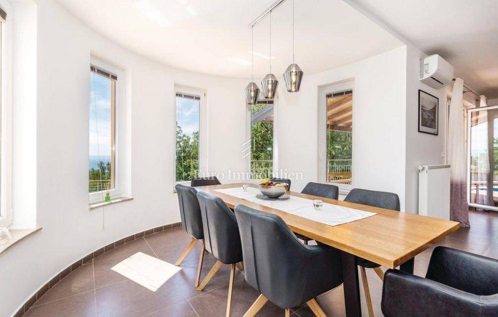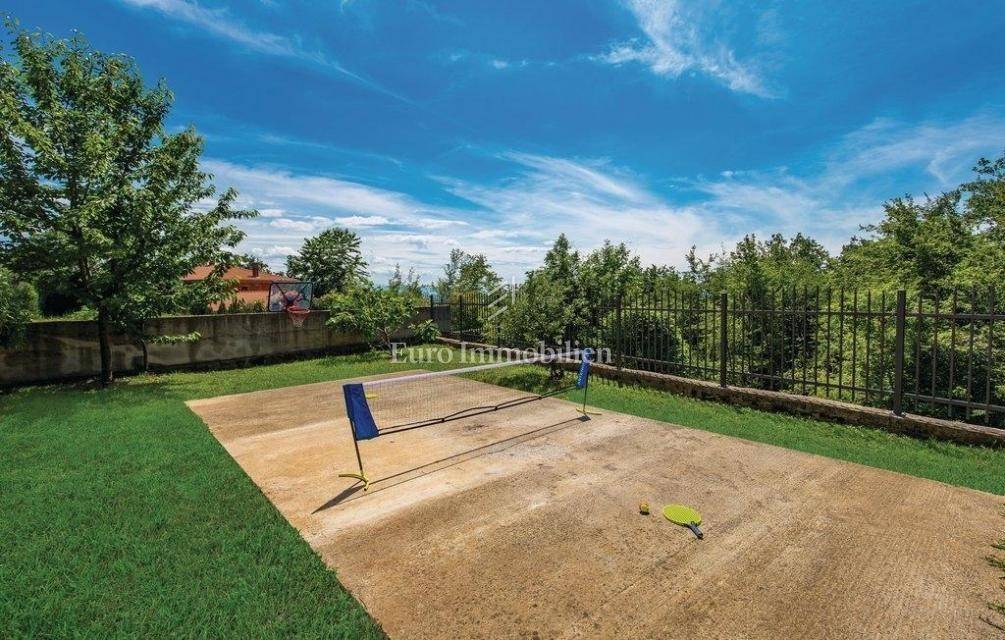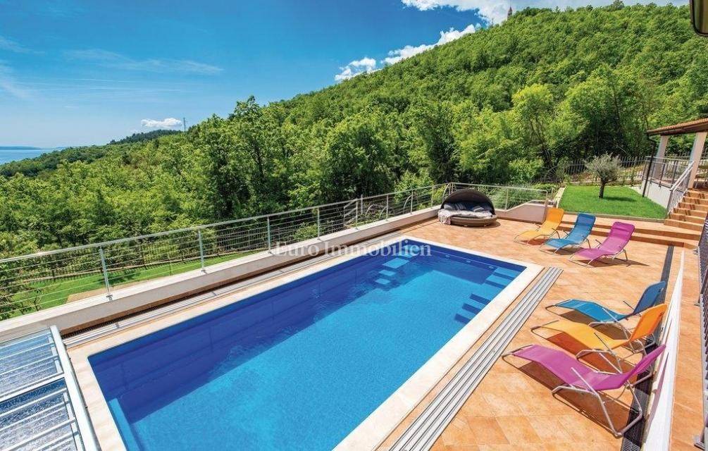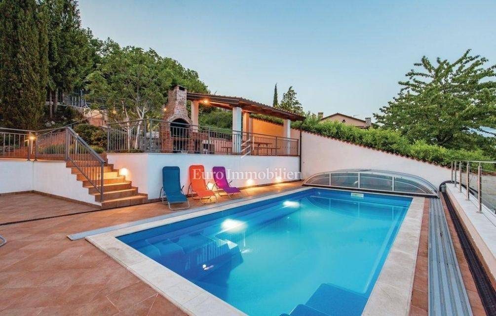 In Veprinac, above Opatija, there is this fully furnished and equipped villa with sea view, surrounded by a large garden with parking spaces, swimming pool, covered terrace with fireplace for barbecue and recreation area. The area of ​​the villa is a comfortable 192 m2, with 5 bedrooms (5 bedrooms + living room). It was built in 2011 and refreshed in 2021. Heating and cooling is provided by air conditioning, radiators (central heating) and underfloor heating, and has a chimney. Sold with furniture. The property is equipped with: automatic night lighting, smart locks on the gate and front door, automatic watering under the grass, cameras and alarm, study, sauna and fitness in the basement, two bathrooms with whirlpool tub, two covered terraces and one balcony, pool area 32 m2, with a roof and remote control, and with a mini tennis / badminton court. Quiet location and environment with open sea views, comfortable and fully decorated interior, proximity to Opatija, the sea and many other facilities are just part of this beautiful property!