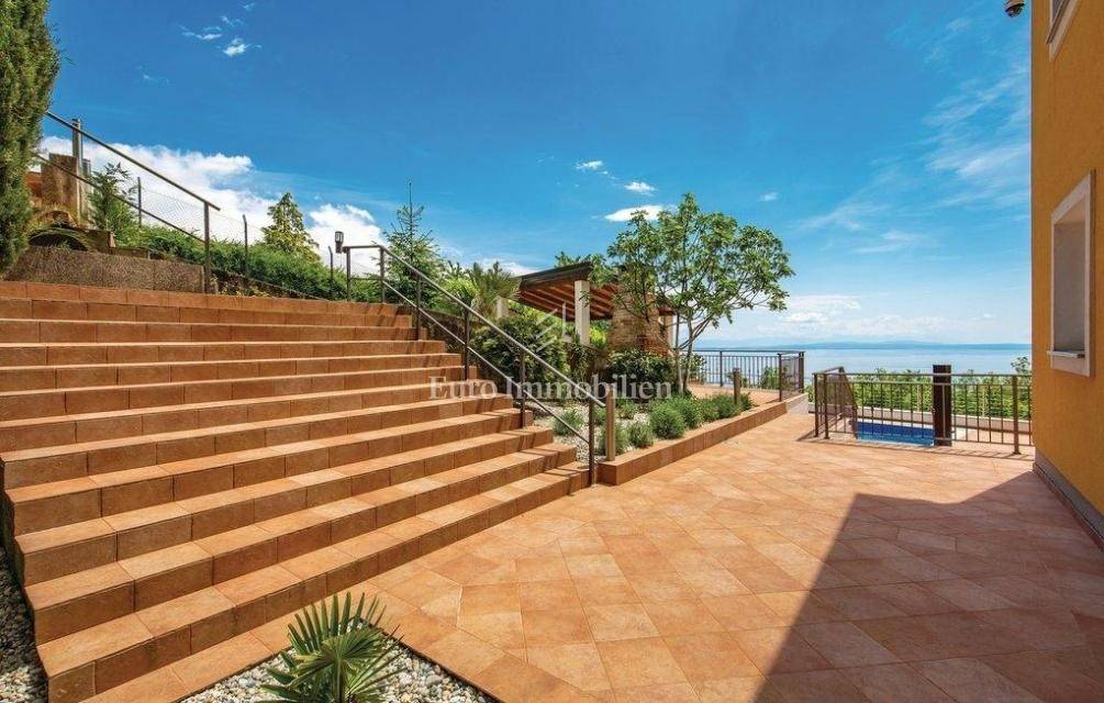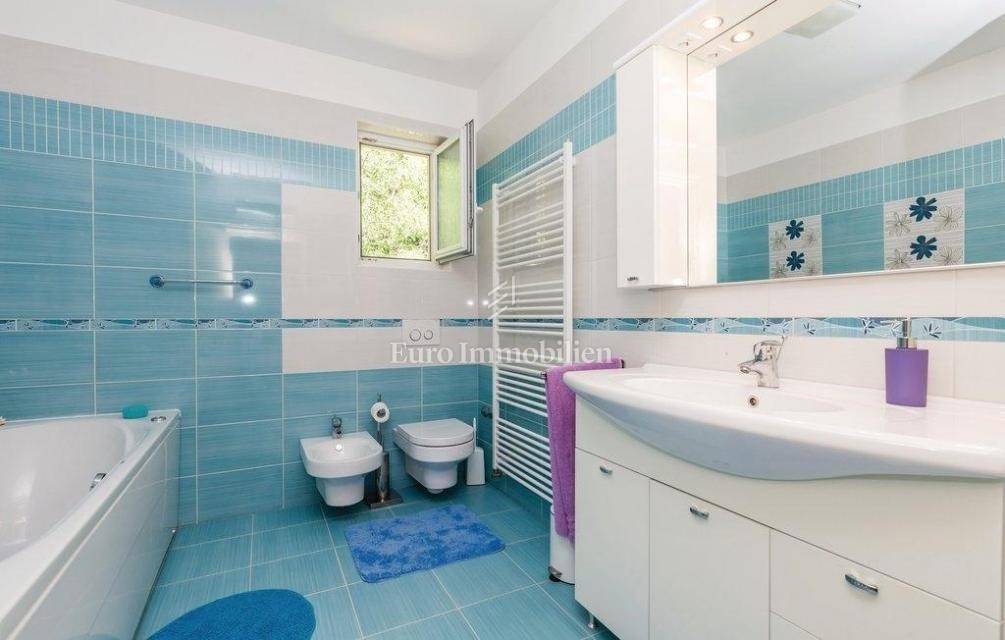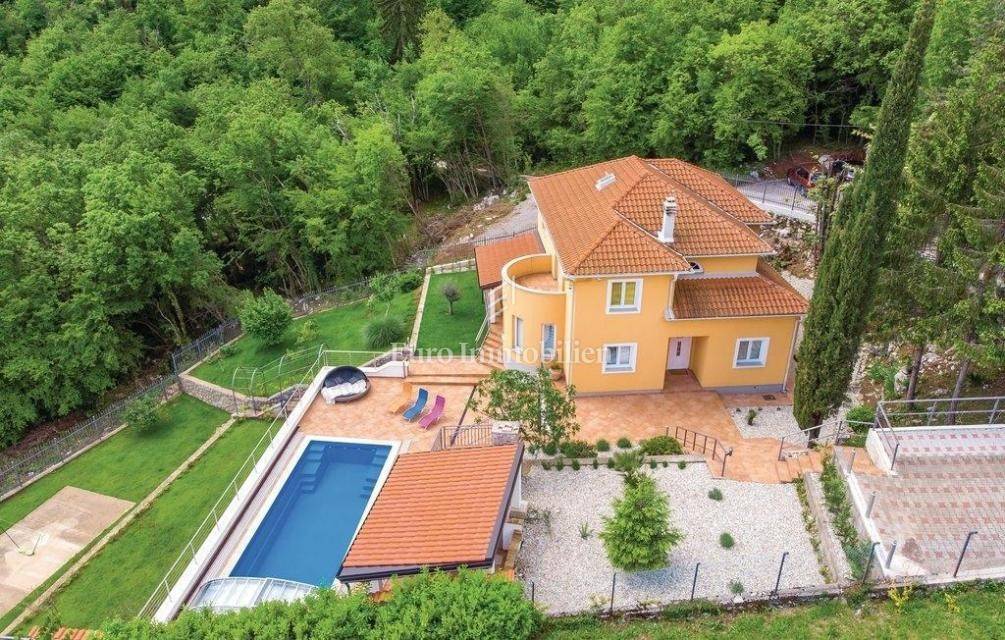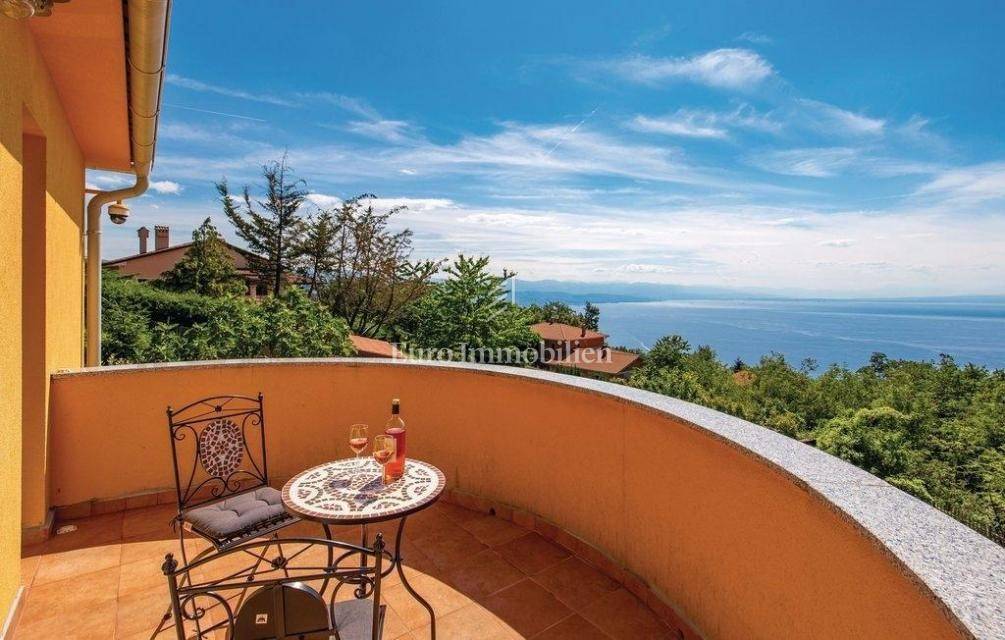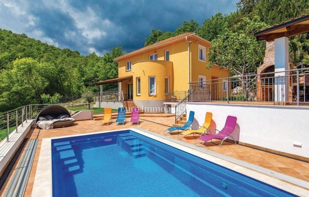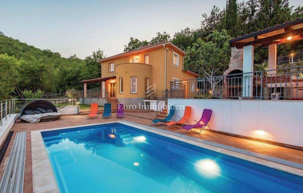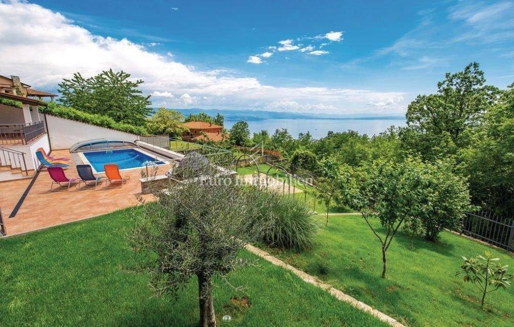 In Veprinac, above Opatija, there is this fully furnished and equipped villa with sea view, surrounded by a large garden with parking spaces, swimming pool, covered terrace with fireplace for barbecue and recreation area. The area of ​​the villa is a comfortable 192 m2, with 5 bedrooms (5 bedrooms + living room). It was built in 2011 and refreshed in 2021. Heating and cooling is provided by air conditioning, radiators (central heating) and underfloor heating, and has a chimney. Sold with furniture. The property is equipped with: automatic night lighting, smart locks on the gate and front door, automatic watering under the grass, cameras and alarm, study, sauna and fitness in the basement, two bathrooms with whirlpool tub, two covered terraces and one balcony, pool area 32 m2, with a roof and remote control, and with a mini tennis / badminton court. Quiet location and environment with open sea views, comfortable and fully decorated interior, proximity to Opatija, the sea and many other facilities are just part of this beautiful property!