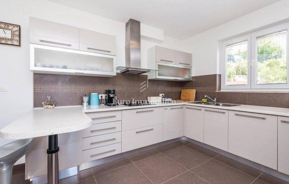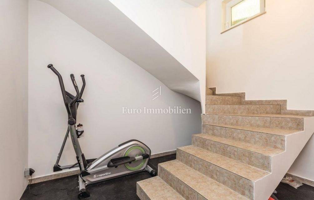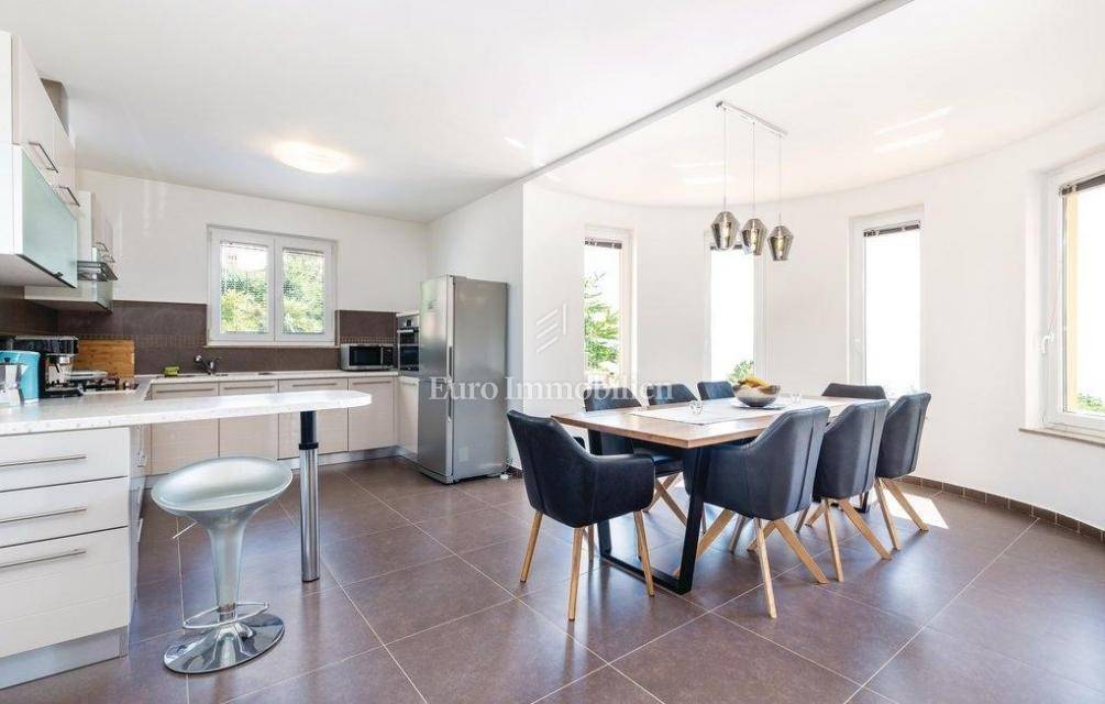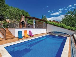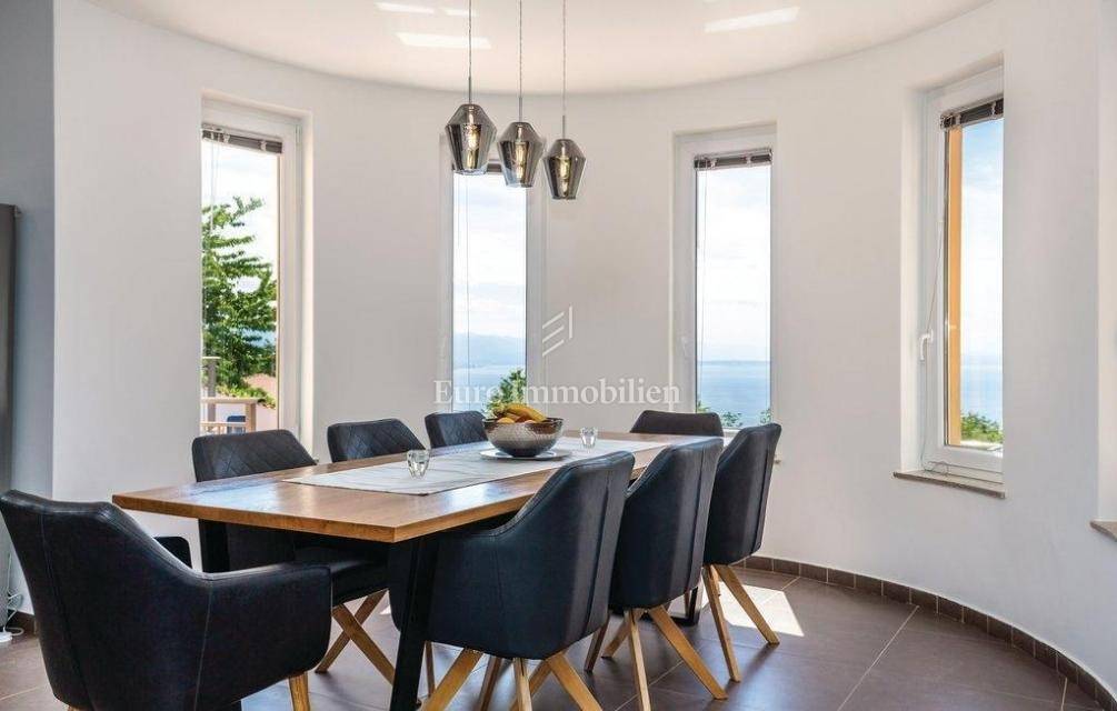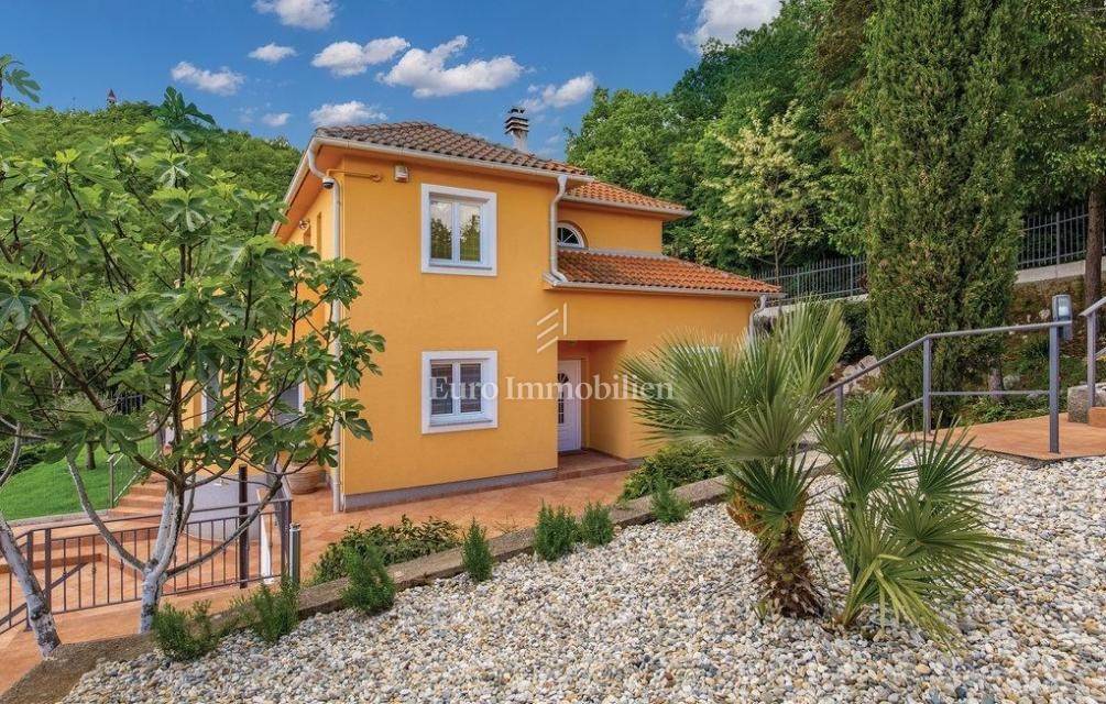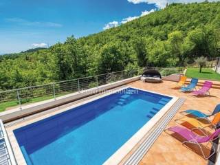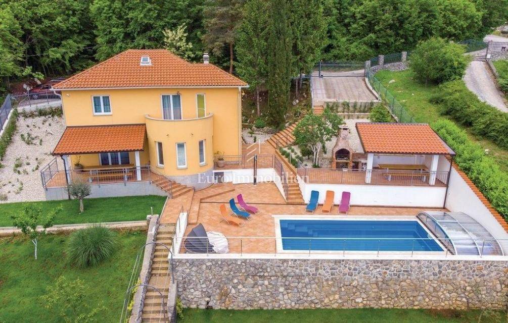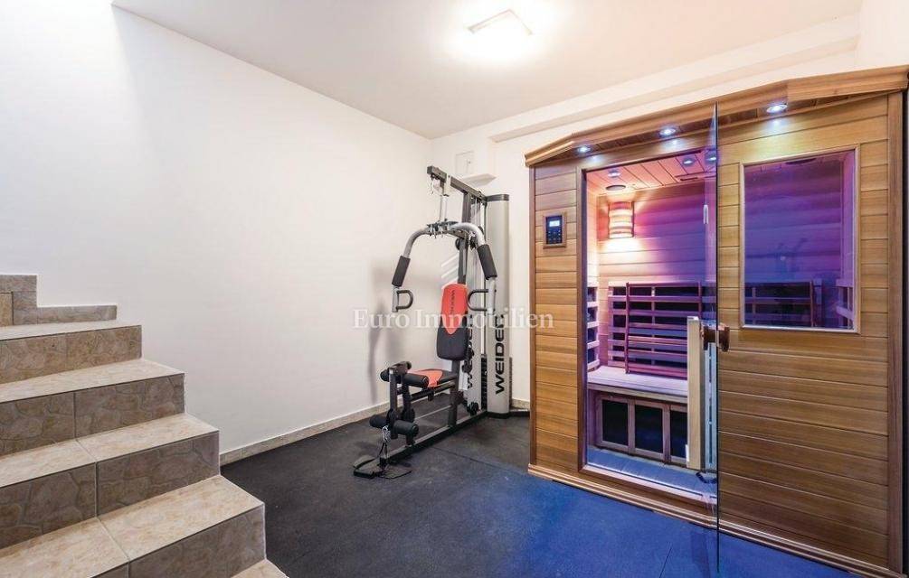 In Veprinac, above Opatija, there is this fully furnished and equipped villa with sea view, surrounded by a large garden with parking spaces, swimming pool, covered terrace with fireplace for barbecue and recreation area. The area of ​​the villa is a comfortable 192 m2, with 5 bedrooms (5 bedrooms + living room). It was built in 2011 and refreshed in 2021. Heating and cooling is provided by air conditioning, radiators (central heating) and underfloor heating, and has a chimney. Sold with furniture. The property is equipped with: automatic night lighting, smart locks on the gate and front door, automatic watering under the grass, cameras and alarm, study, sauna and fitness in the basement, two bathrooms with whirlpool tub, two covered terraces and one balcony, pool area 32 m2, with a roof and remote control, and with a mini tennis / badminton court. Quiet location and environment with open sea views, comfortable and fully decorated interior, proximity to Opatija, the sea and many other facilities are just part of this beautiful property!