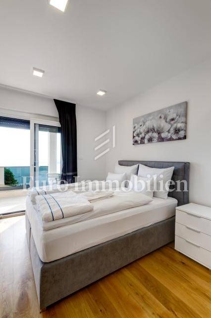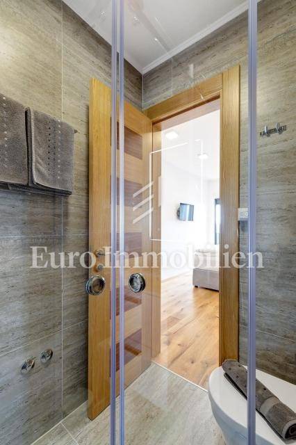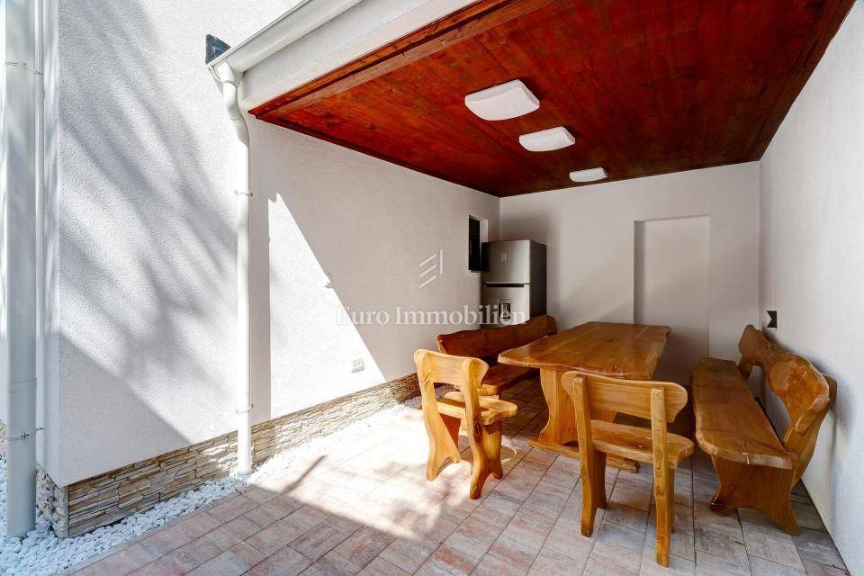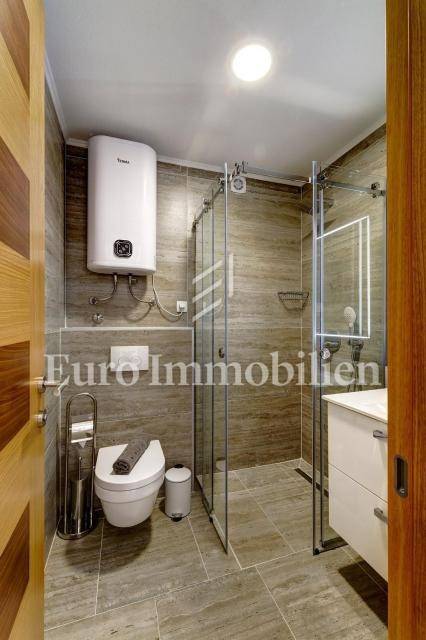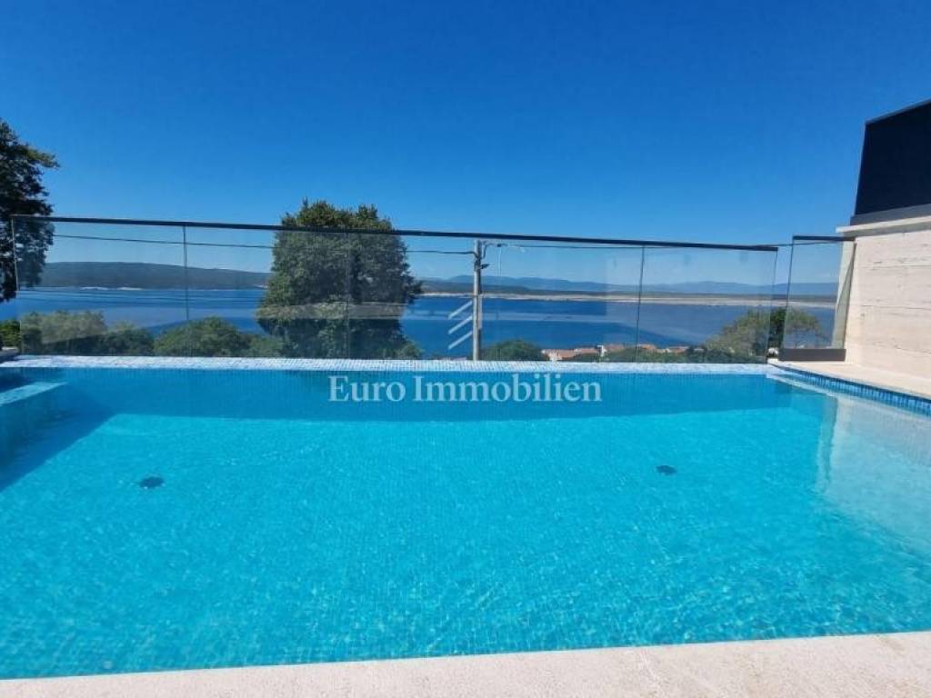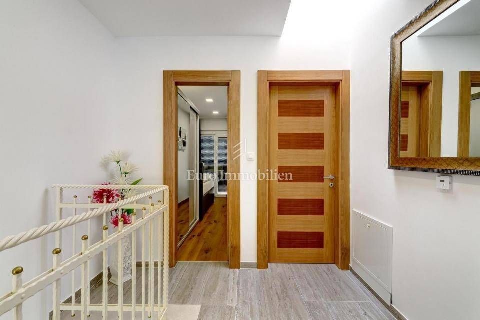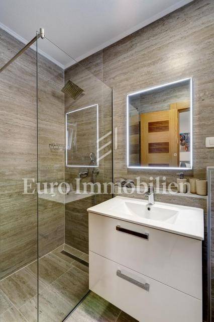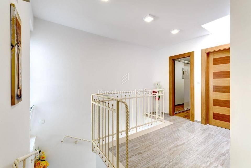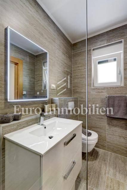 It consists of a basement (large open space, bathroom, storage), ground floor (room with bathroom, living room, kitchen, toilet, and terrace with pool), and first floor (three bedrooms each with its bathroom). The house is connected by an internal staircase. It offers a fantastic view of the sea, and the house is fully air-conditioned and has preparation for underfloor heating and high-quality interior and exterior carpentry. The yard is landscaped, fenced, and paved.