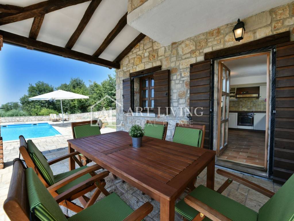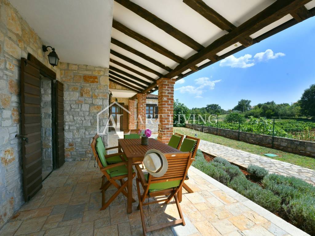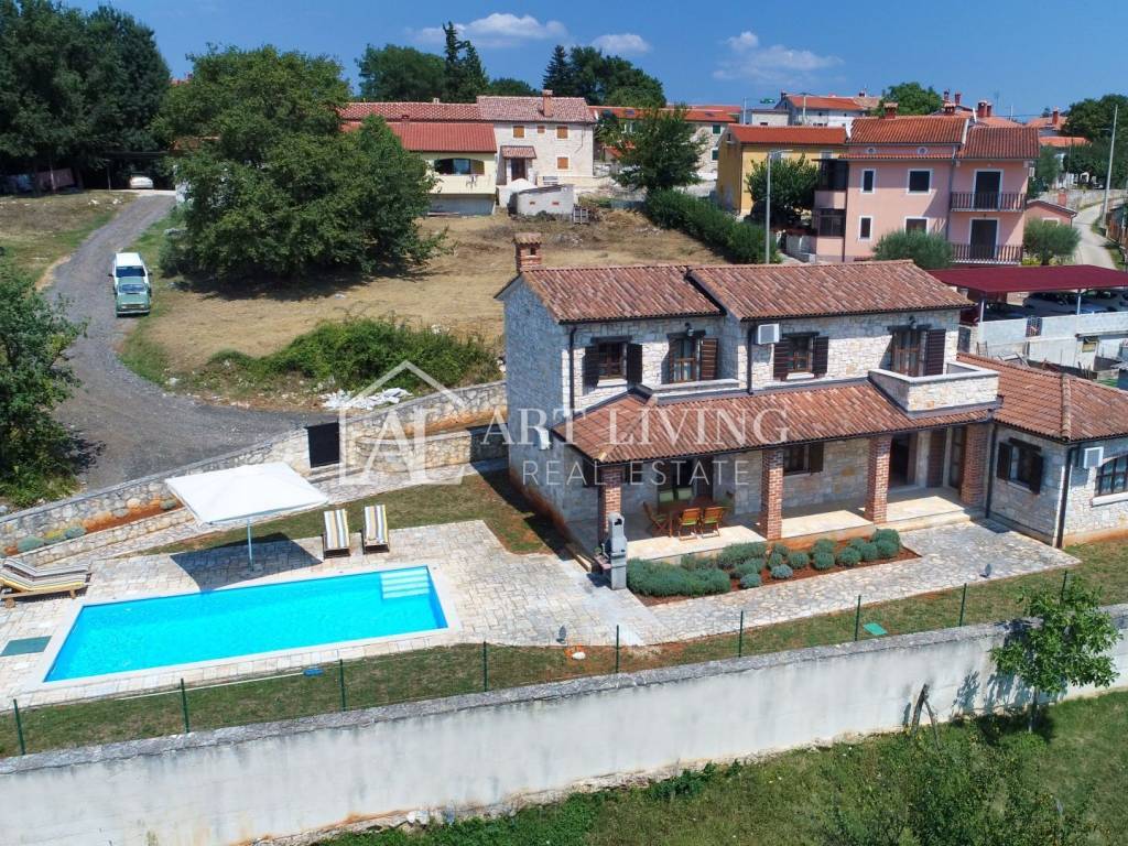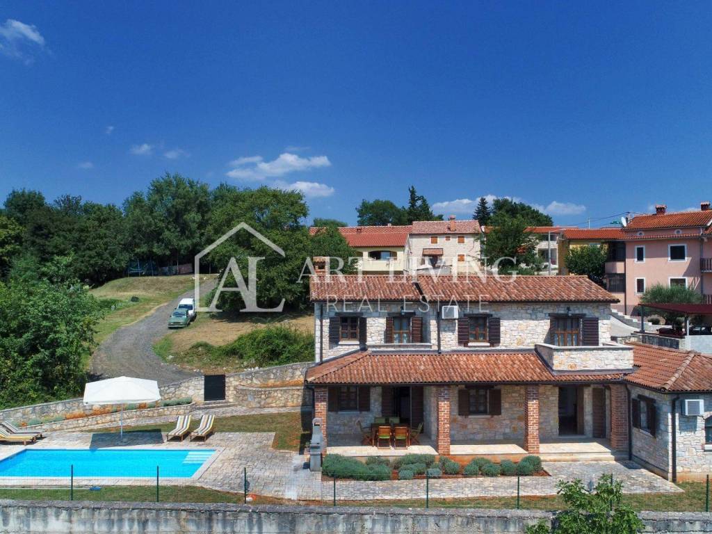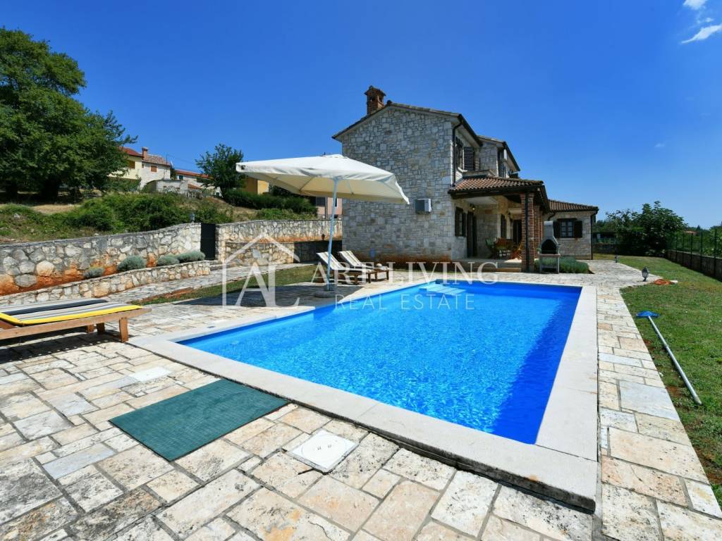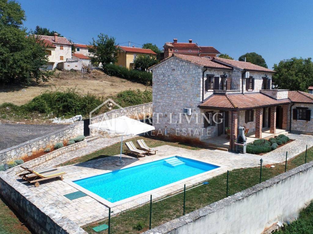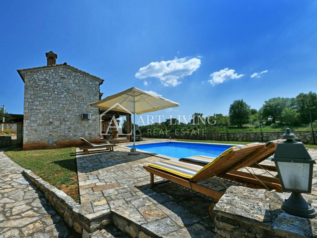 In an idyllic Istrian village surrounded by nature and beautiful Istrian landscape, a charming Istrian-style stone villa with a swimming pool is for sale, 17 km from the town of Poreč and its beautiful beaches and 13 km from the charming Istrian pearl of Grožnjan