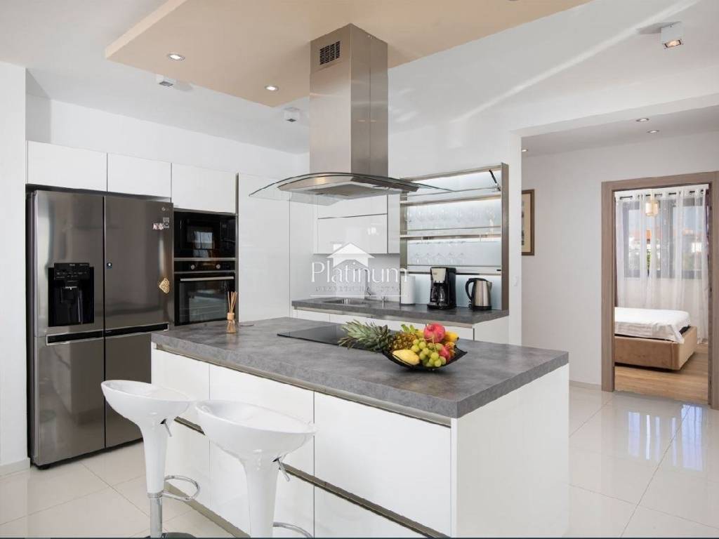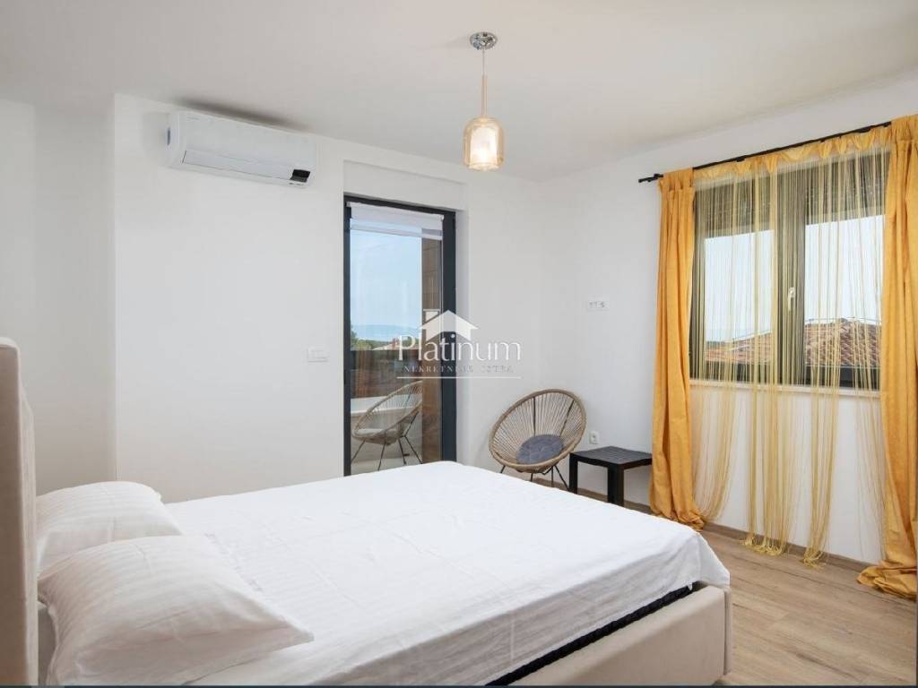 In Ližnjan, in a quiet place, there is this house with four apartments, and for sale is an apartment on the second floor of 143m2, which consists of a hallway, a living room and a kitchen, from which there is access to a covered terrace. three bedrooms, one of which has its own bathroom. The storage room is on the last floor, and the apartment also has a parking space. The apartment is sold fully furnished as shown in the pictures. There are air conditioners in all rooms, and floor heating in the living room and kitchen. Close to shops, schools and restaurants. An ideal place for family living or as an investment for rent. Usage permission. Contact 00385951987708
