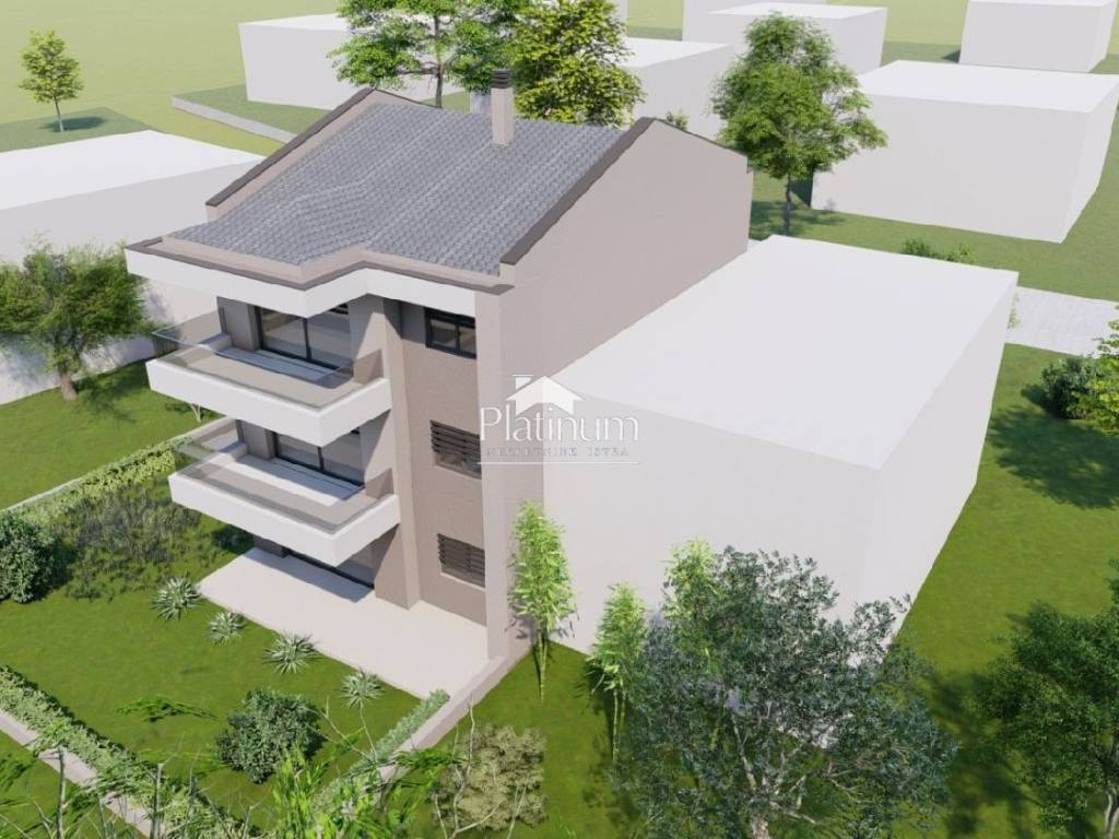 In the vicinity of Fažana, a new building is in the initial phase of construction, which will consist of the ground floor, first and second floors. An apartment for sale on the first floor will consist of two bedrooms, a living room with a kitchen and dining room, a bathroom, a storage room and a terrace and two parking spaces (included in the price). PVC and ALU carpentry with electric blinds and mosquito nets, three heatin