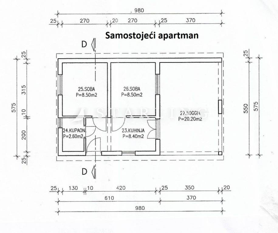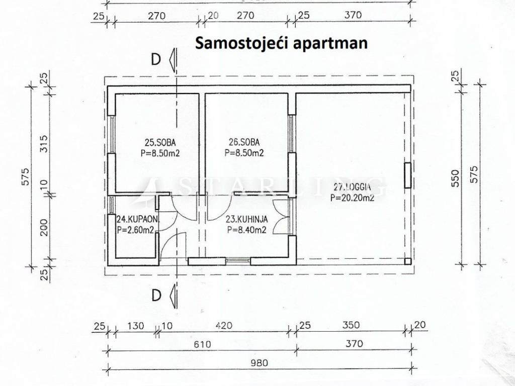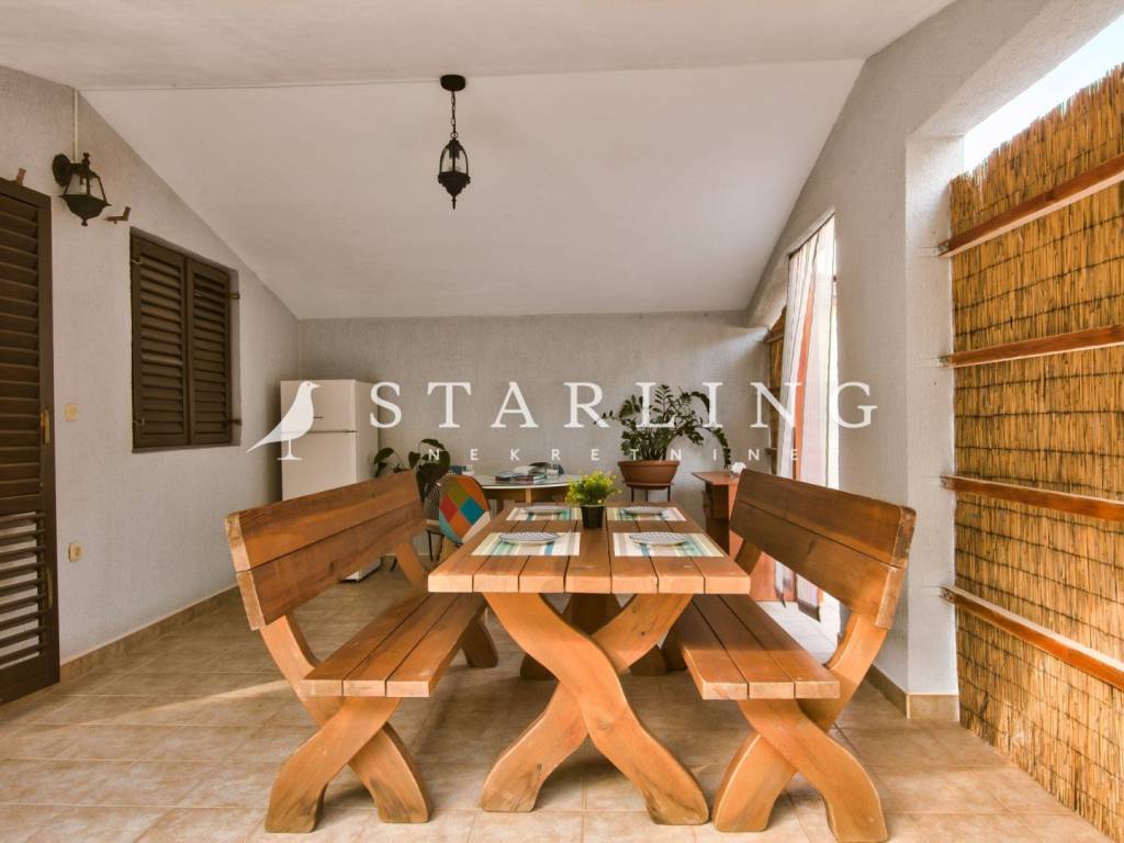 This property consists of a main house of 130 m2 in which there is a two-story apartment. The ground floor of the apartment consists of a living room with access to the terrace and garden, two bedrooms, a kitchen and a bathroom, while the second floor consists of 3 bedrooms, a kitchen, a bathroom and a loggia.