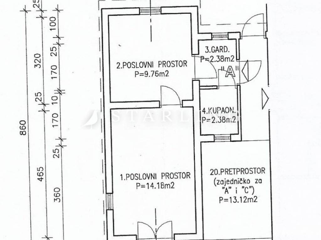 The second commercial space on the ground floor, measuring 28.70 m2, consists of an entrance hall, two rooms, a wardrobe and a bathroom. It is currently used as an office but can easily be converted into an apartment.