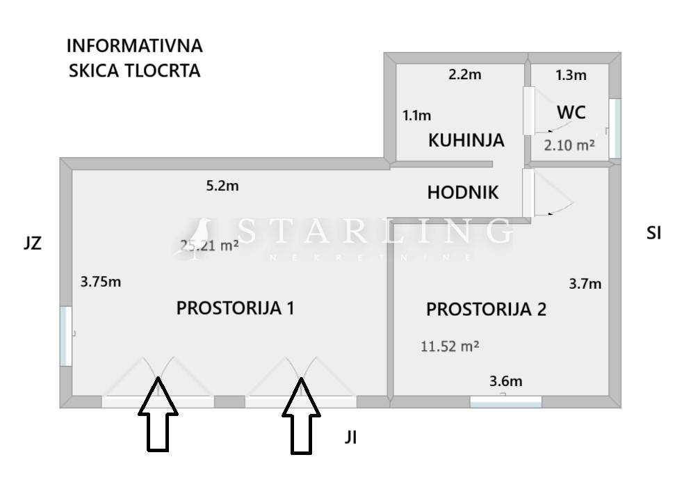 Prostor se sastoji od dvije prostorije, hodnika, kuhinje i WC-a. Ima dva ulaza sa terase.