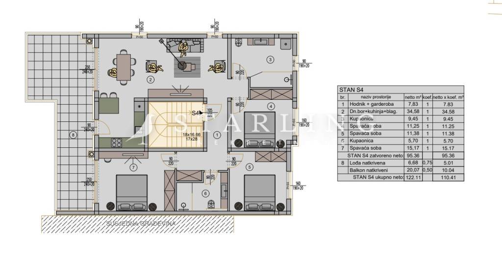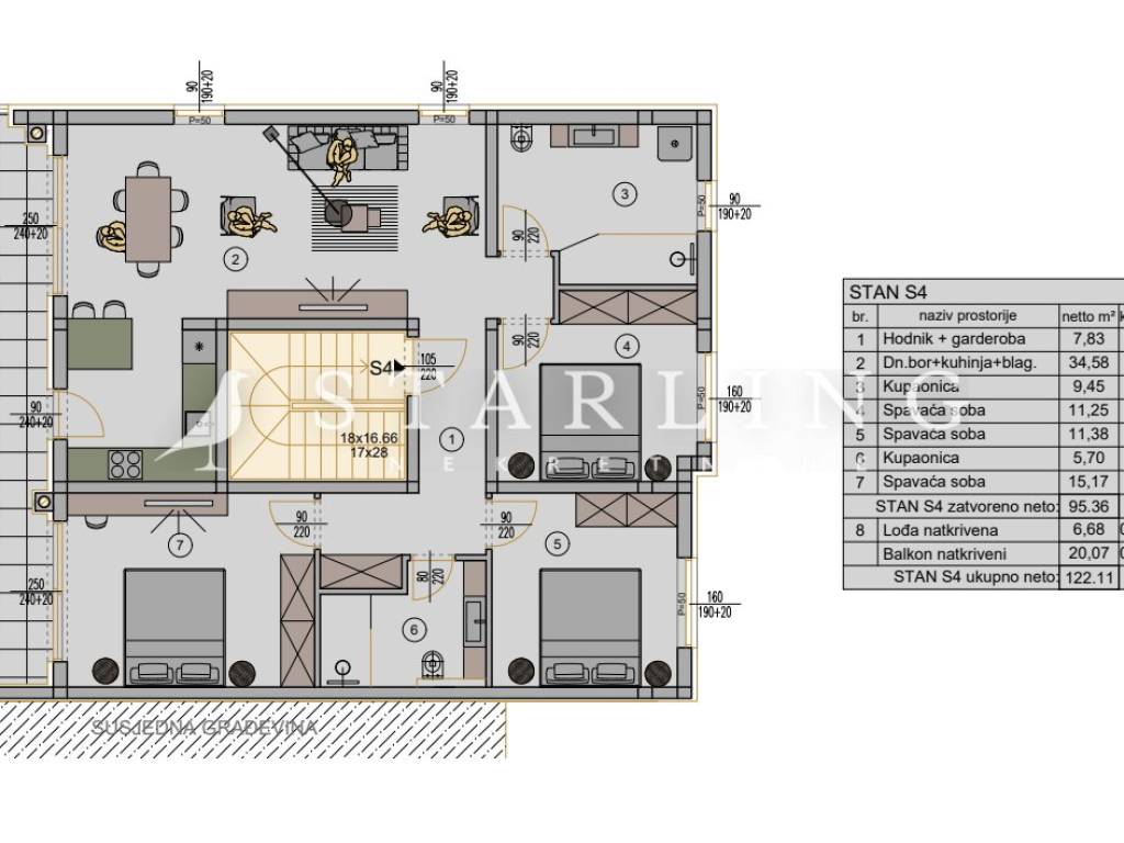 An apartment on the second floor of a new building, with a total area of 114 m², is for sale. It consists of three bedrooms, a living room with kitchen and dining area, and two modern bathrooms. The master bedroom has its own en-suite bathroom. A spacious terrace adds special value, ideal for outdoor living.