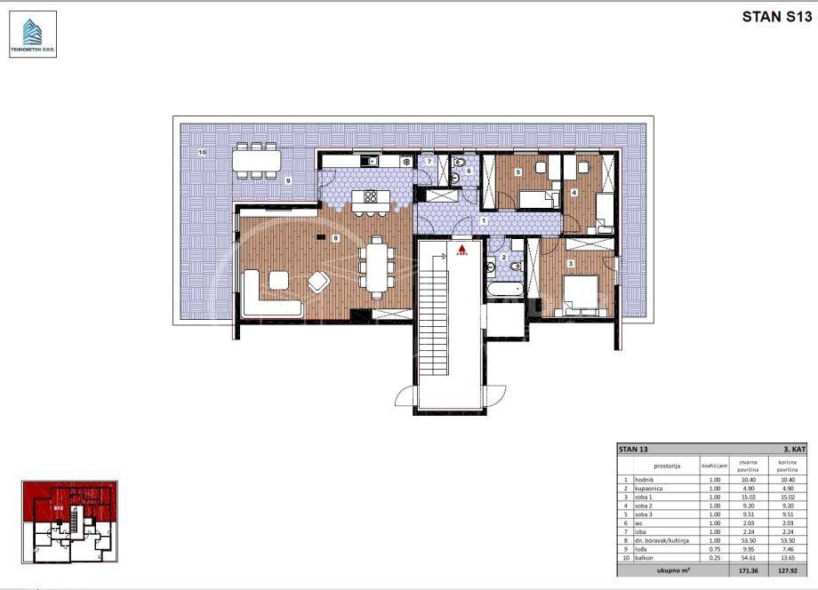 Ukupna stvarna površina stana iznosi 171,36 m2, dok obračunska površina iznosi 127,92 m2.