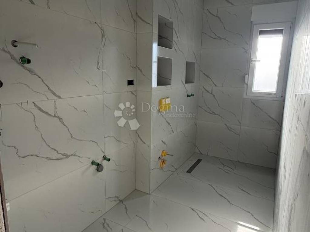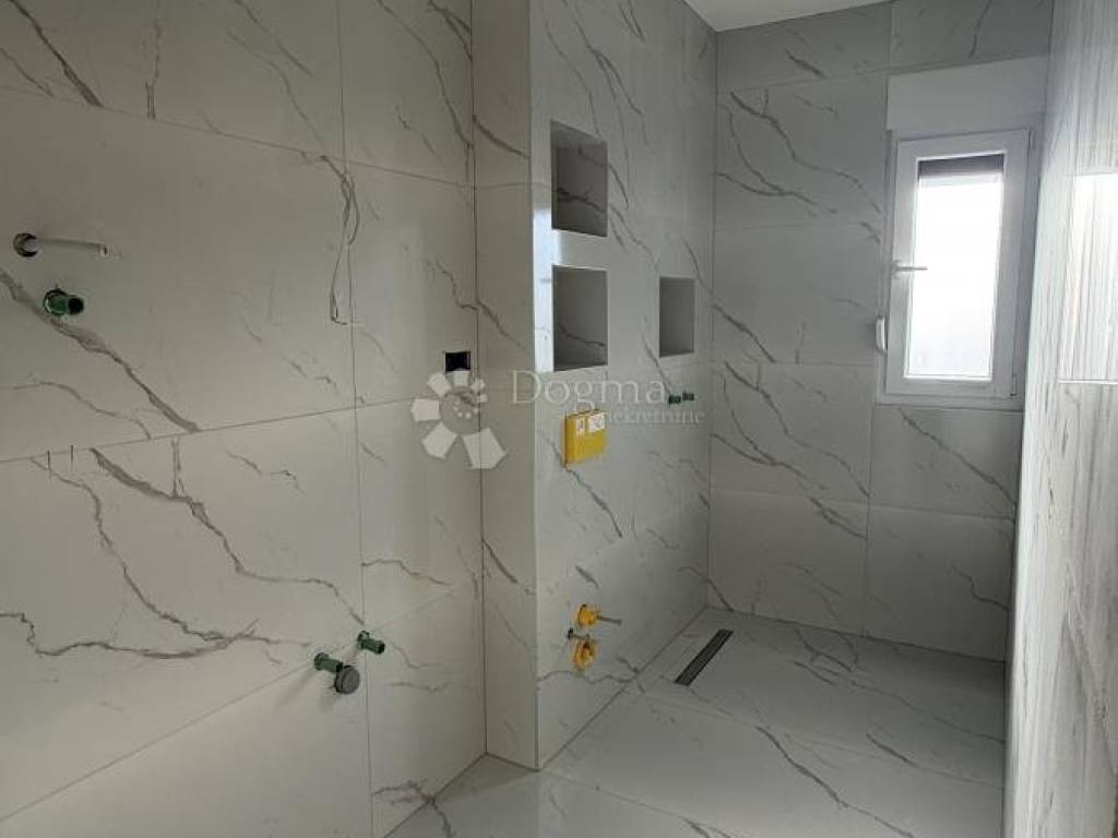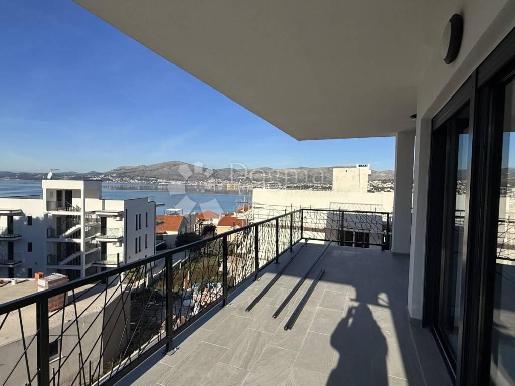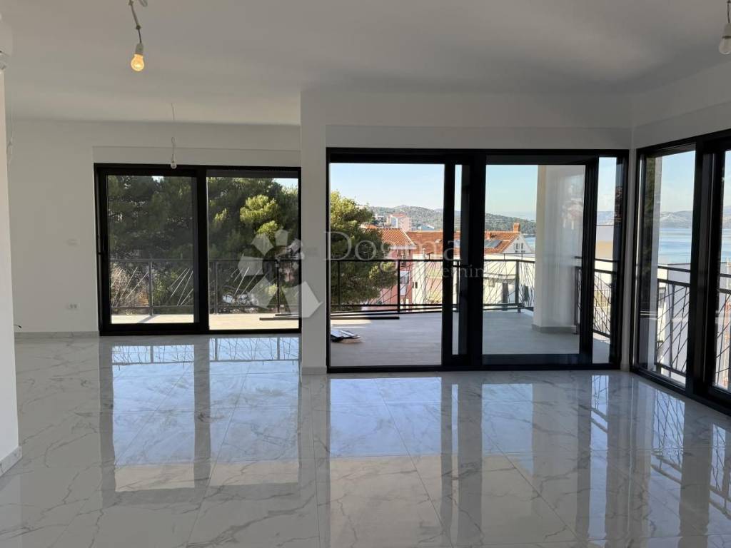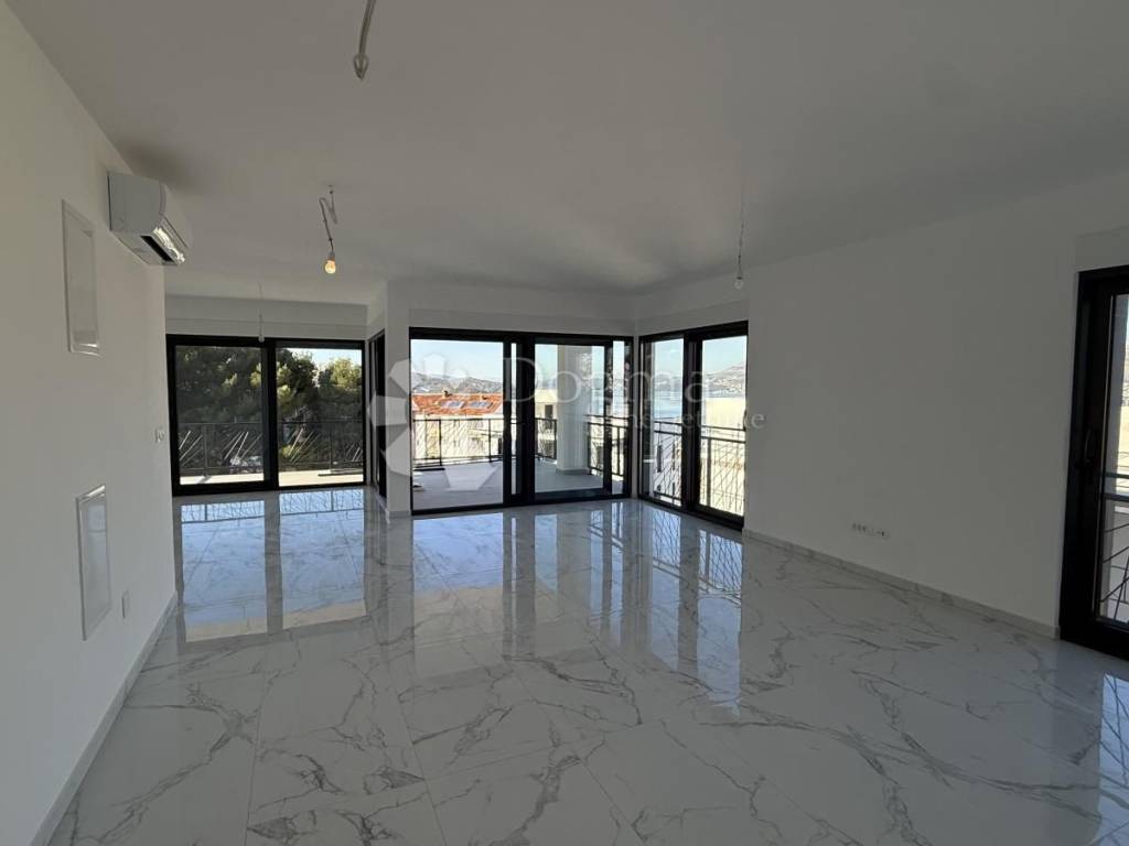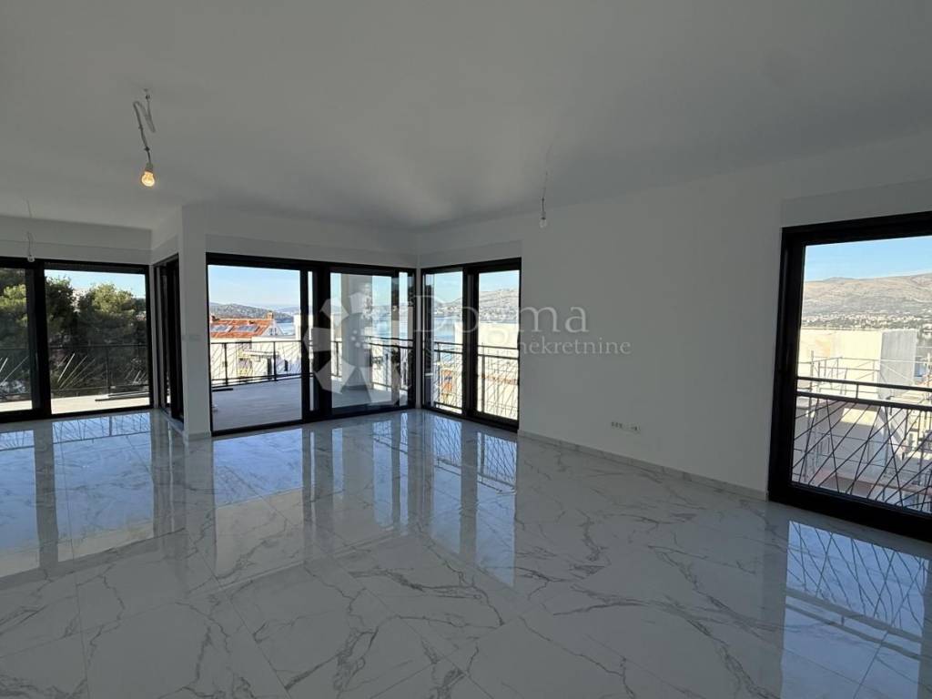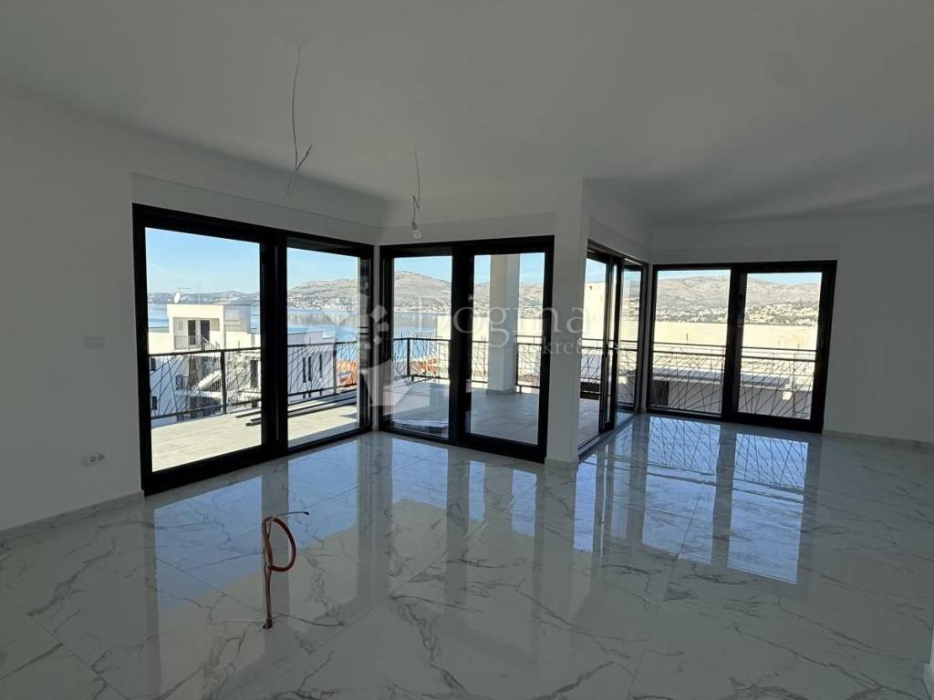 In a quiet part of Okrug Gornji on the island of Čiovo, this luxurious penthouse is located in a smaller residential building with a total of five apartments. The building is of high-quality construction, with reinforced concrete load-bearing walls and an open staircase. Residents have access to a shared swimming pool with a net area of 36 m. Each apartment includes one outdoor parking space.
