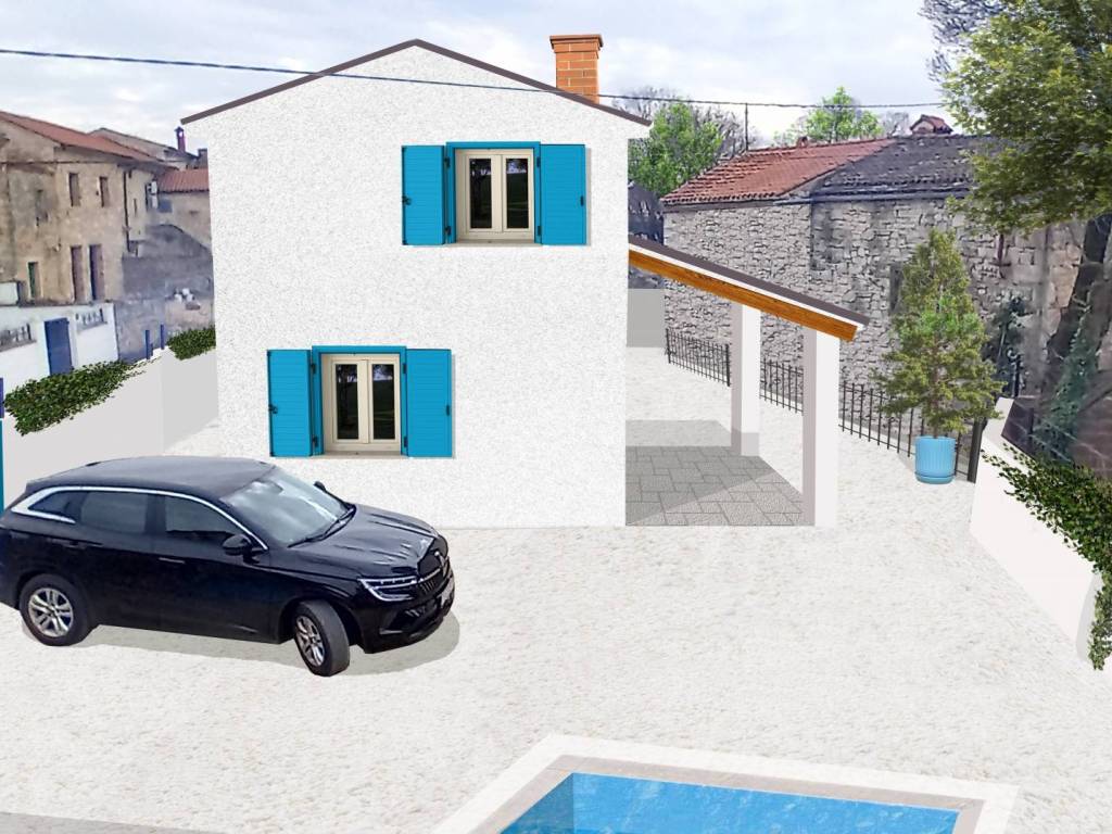 -Zemljište s izgrađenom kućom u roh-bau fazi, to jest, stavljenom kućom pod krov, ožbukanom izvana i vanjska stolarija, te iskopan bazen, septička u funkciji, vanjska kućica s kaminom kompletirana i ogradni zidovi. Cijena 250000 eura.